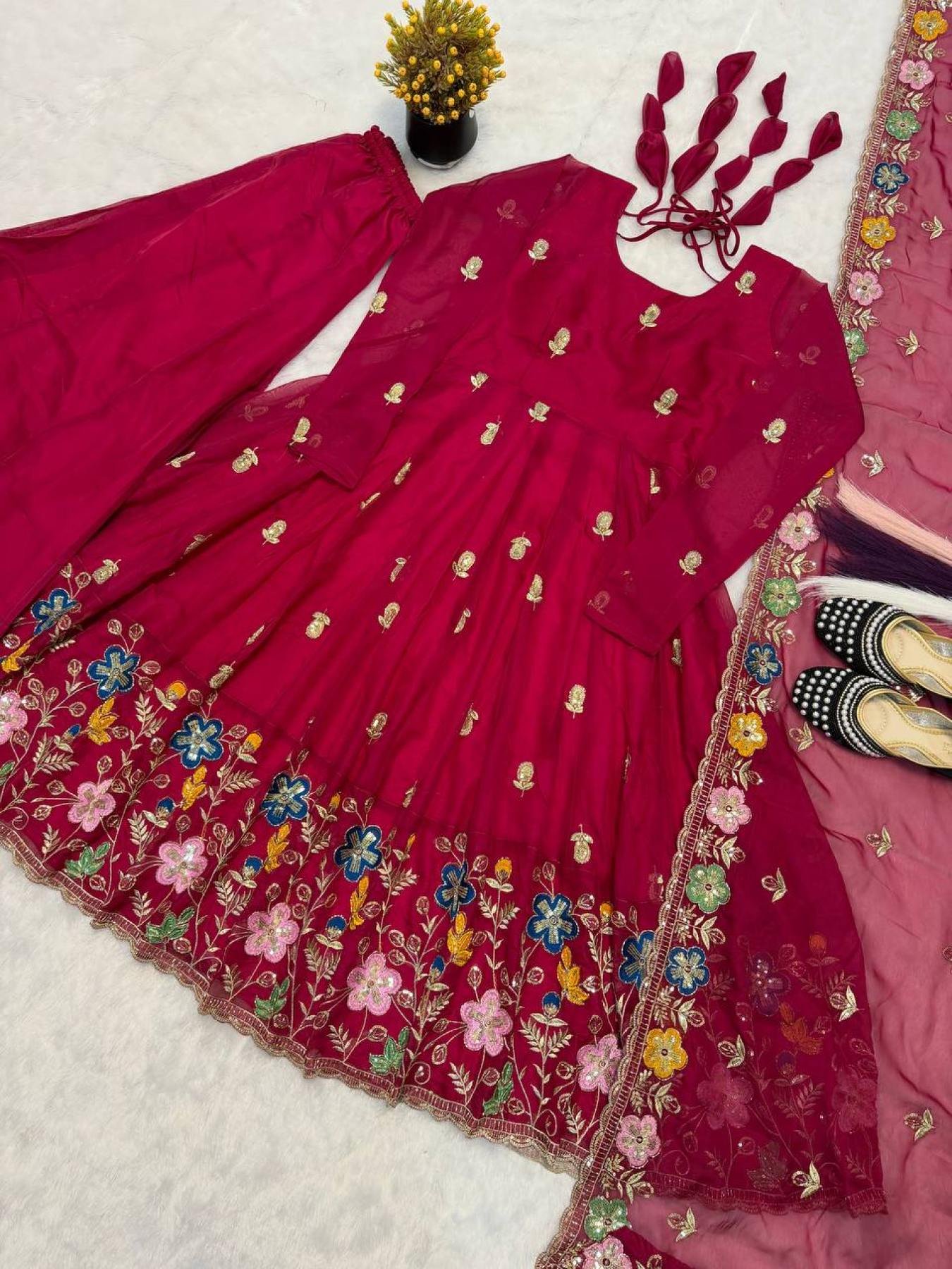 Deep Red Tabby Organza Anarkali Suit Set with Beads and Embroidery Work at Wholesale Rate for B2B