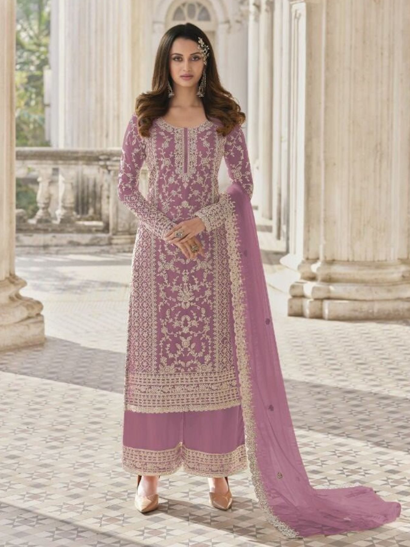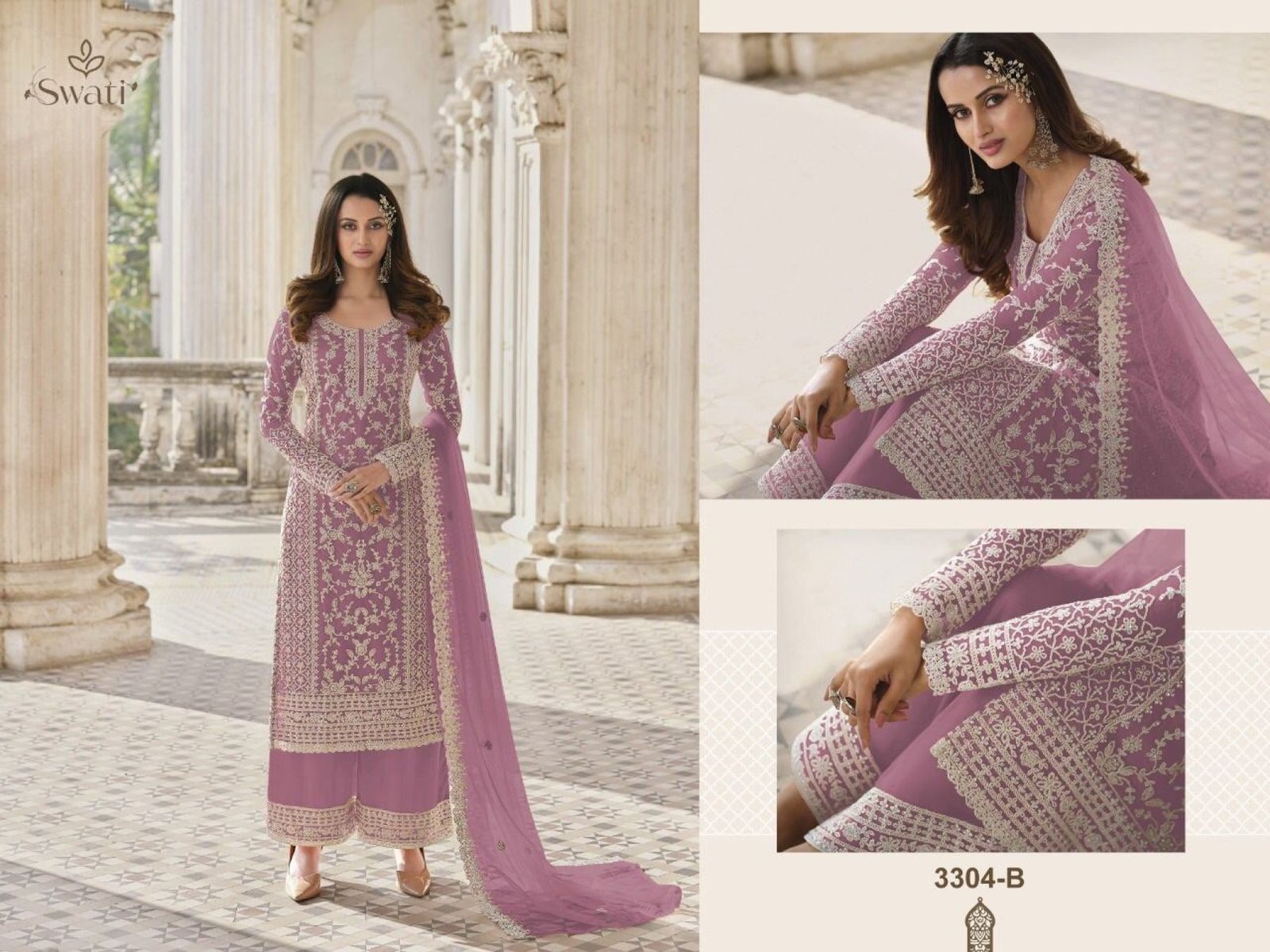 This semi-stitched designer suit features rich butterfly net fabric with exquisite embroidery, giving a luxurious festive look. The Japan satin inner enhances comfort and adds a graceful fall. Paired with a butterfly net dupatta and matching bottom material, it is perfect for weddings, engagements, and partywear orders.