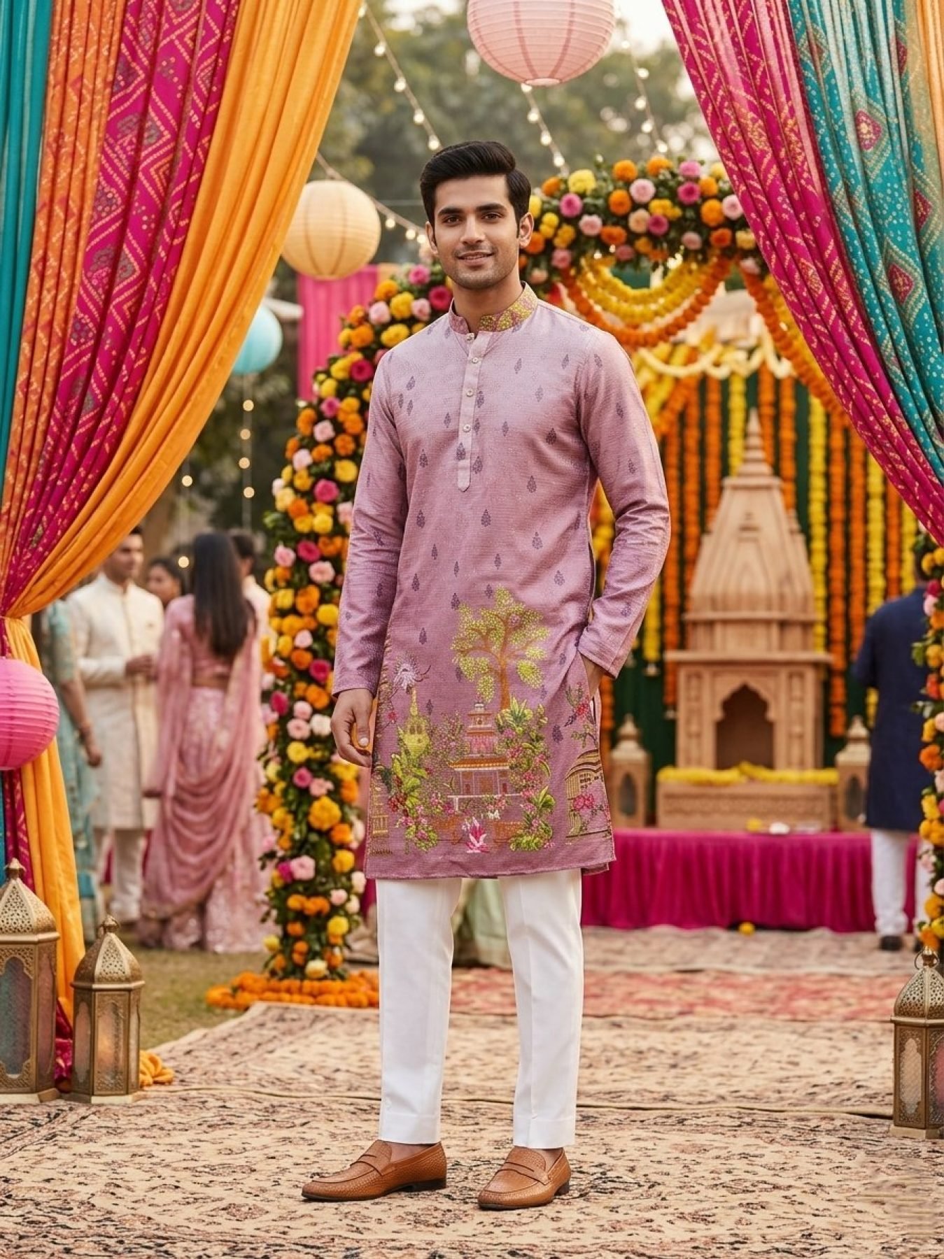Delightful Purple Printed Mens Kurta with Crochet Sequins Detailing