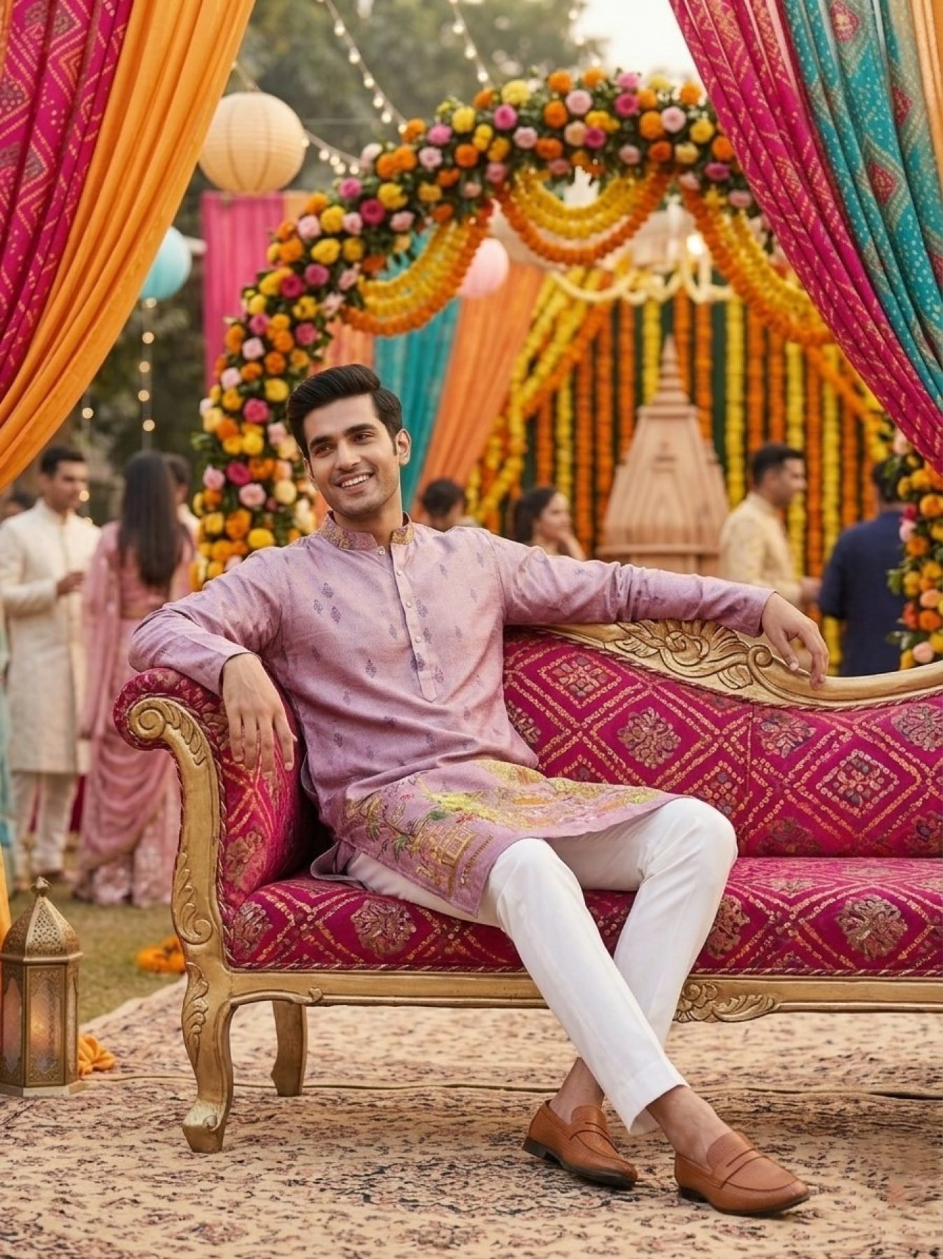 Stylish men’s cotton kurta with digital print and crochet sequins work. Available with or without pant, perfect for festive and casual traditional wear.