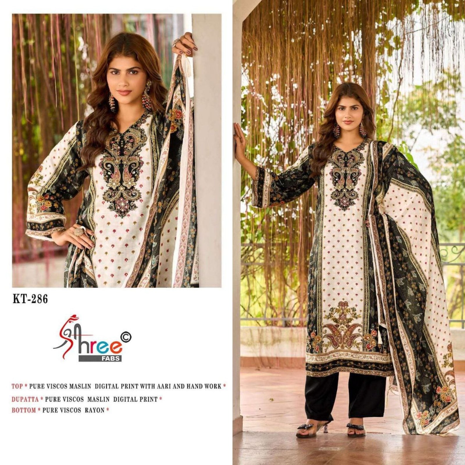 KT 286 features a premium pure maslin top adorned with beautiful digital prints and detailed aari handwork, offering a refined ethnic look.