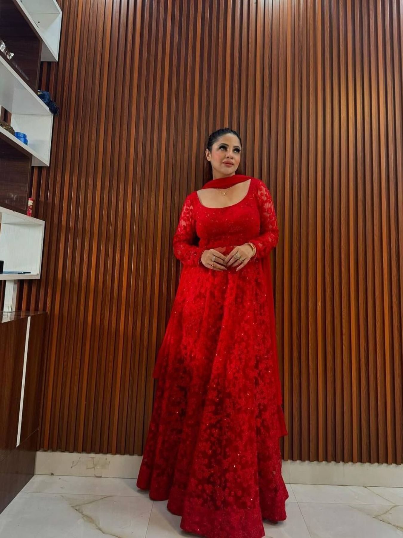Size ChartCherry Red Anarkali Style Net Designer Suit