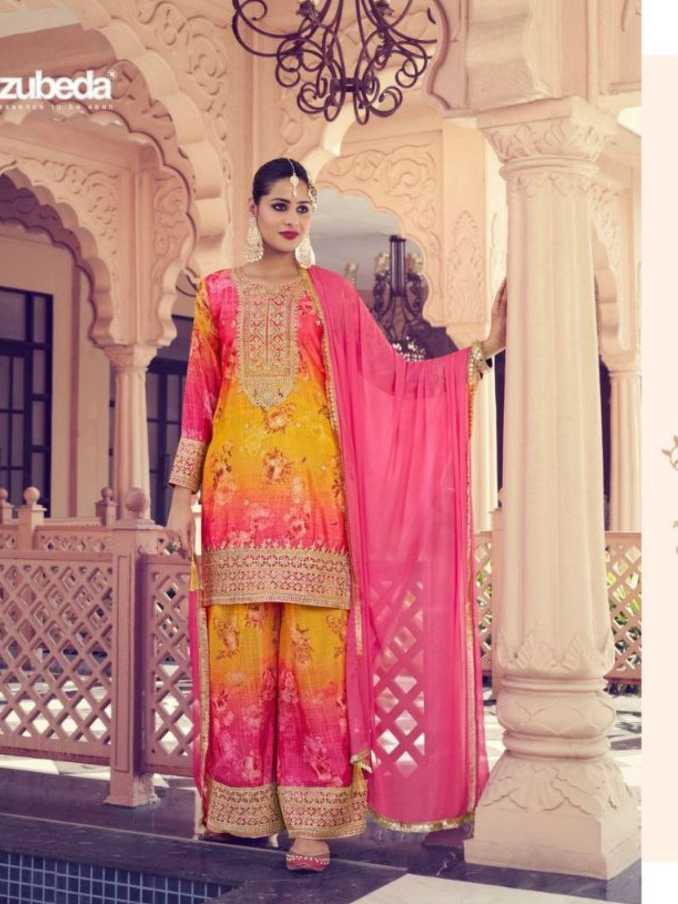 Bottom: Stylish Chinon Plazo with matching embroidery and digital print detailing