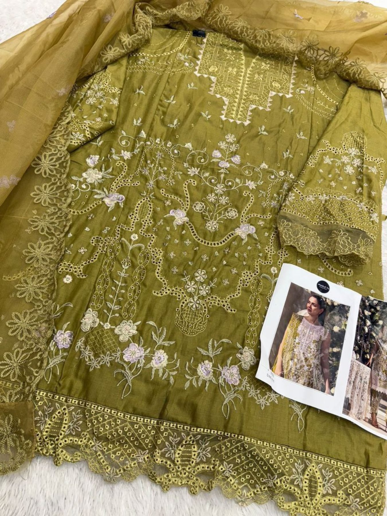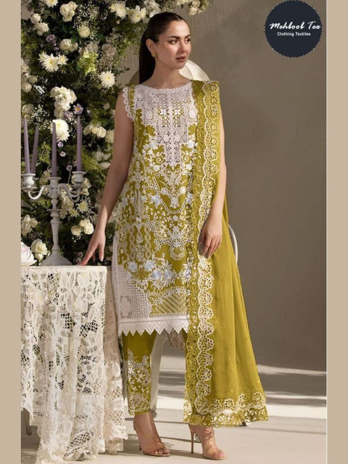 Mehboob Catalog Design No. 7773 features a pure cotton suit with heavy self embroidery, paired with a soft semi-lawn bottom and a richly embroidered kota doriya dupatta. A graceful ethnic set perfect for summer wear, festive occasions, and wholesale boutique collections.