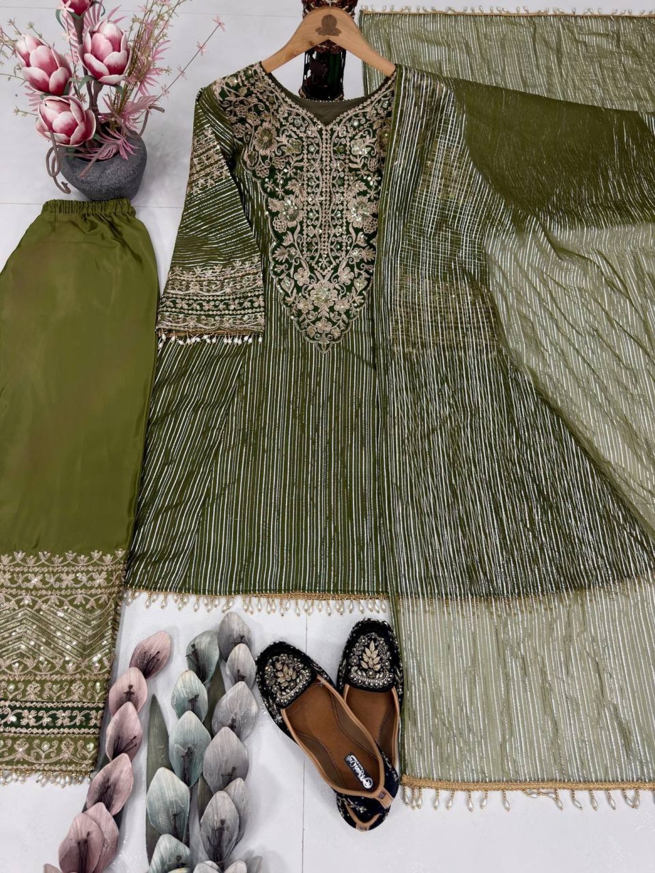 Celebrate Eid in elegance with our New Designer Anarkali Short Top with Palazzo Set, specially crafted for boutique showrooms and wholesale buyers. Designed in a rich Mehndi color, this outfit features luxurious fabrics and intricate craftsmanship for a premium festive look.