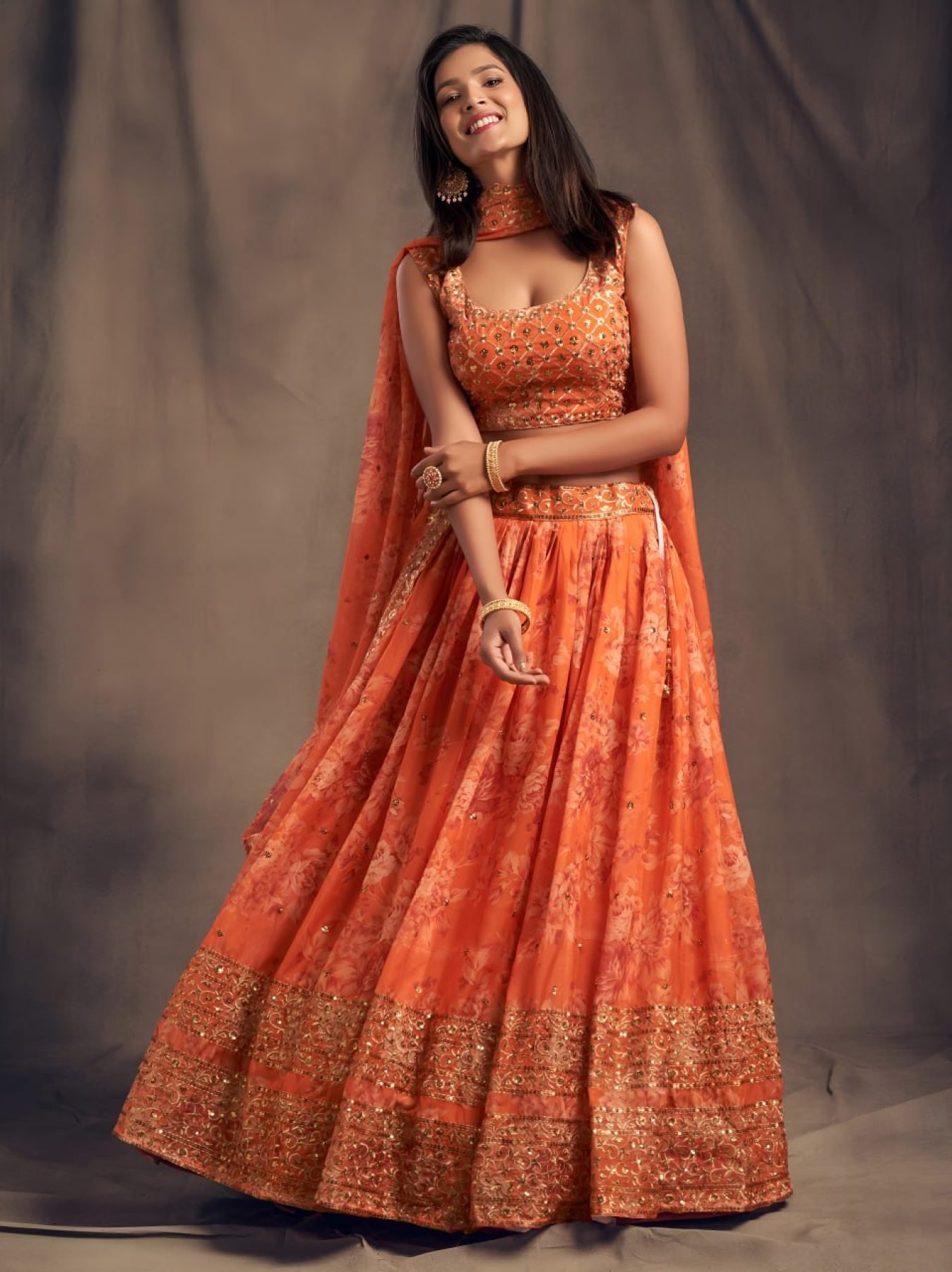 Elegant floral printed organza lehenga set enhanced with sequins and zari embroidery work. Paired with matching blouse and dupatta, this graceful ensemble is perfect for weddings, festive functions, and special occasions.