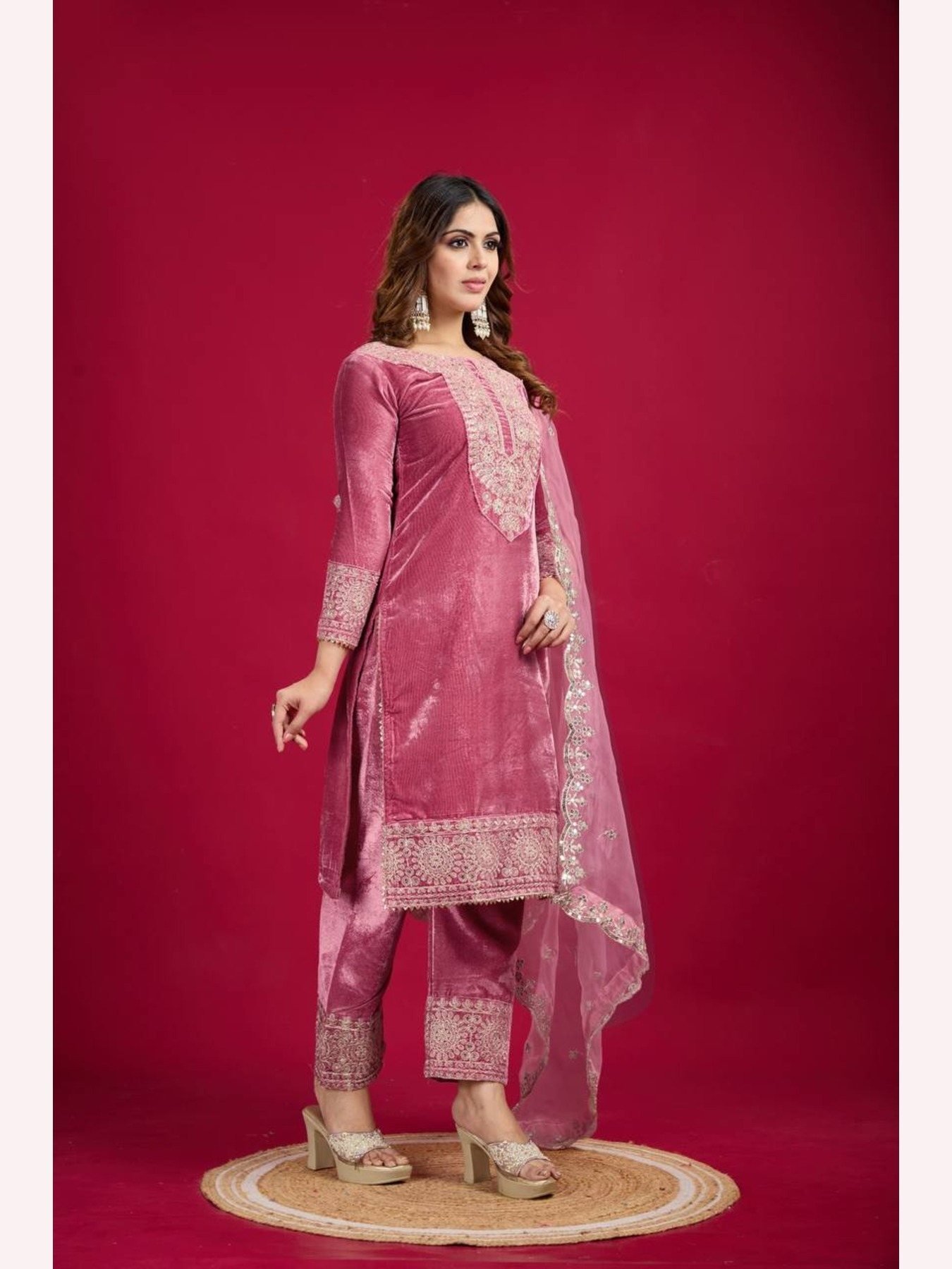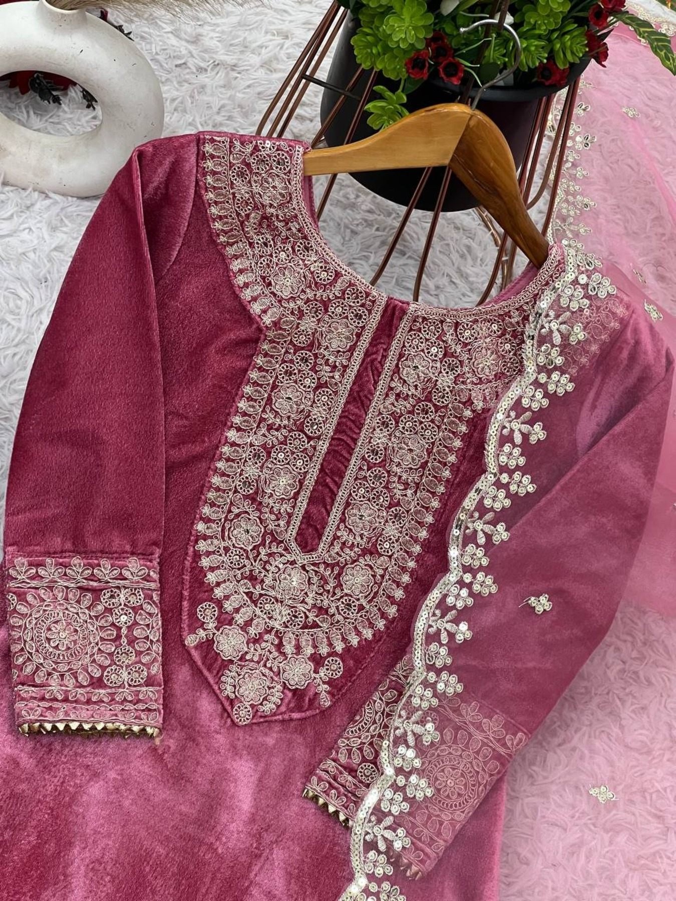 Designer Party Wear Viscos Velvet Pink Suit Set With Heavy Embroidery Work