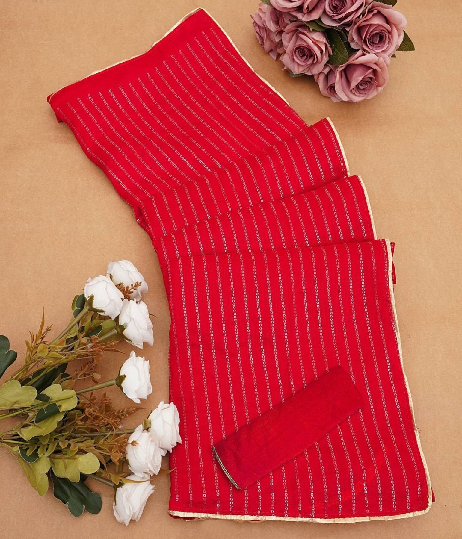 Elegant Vichitra silk saree featuring fine embroidery with 3mm sequins and gold piping lace border. Perfect for weddings, festive wear, and party occasions.