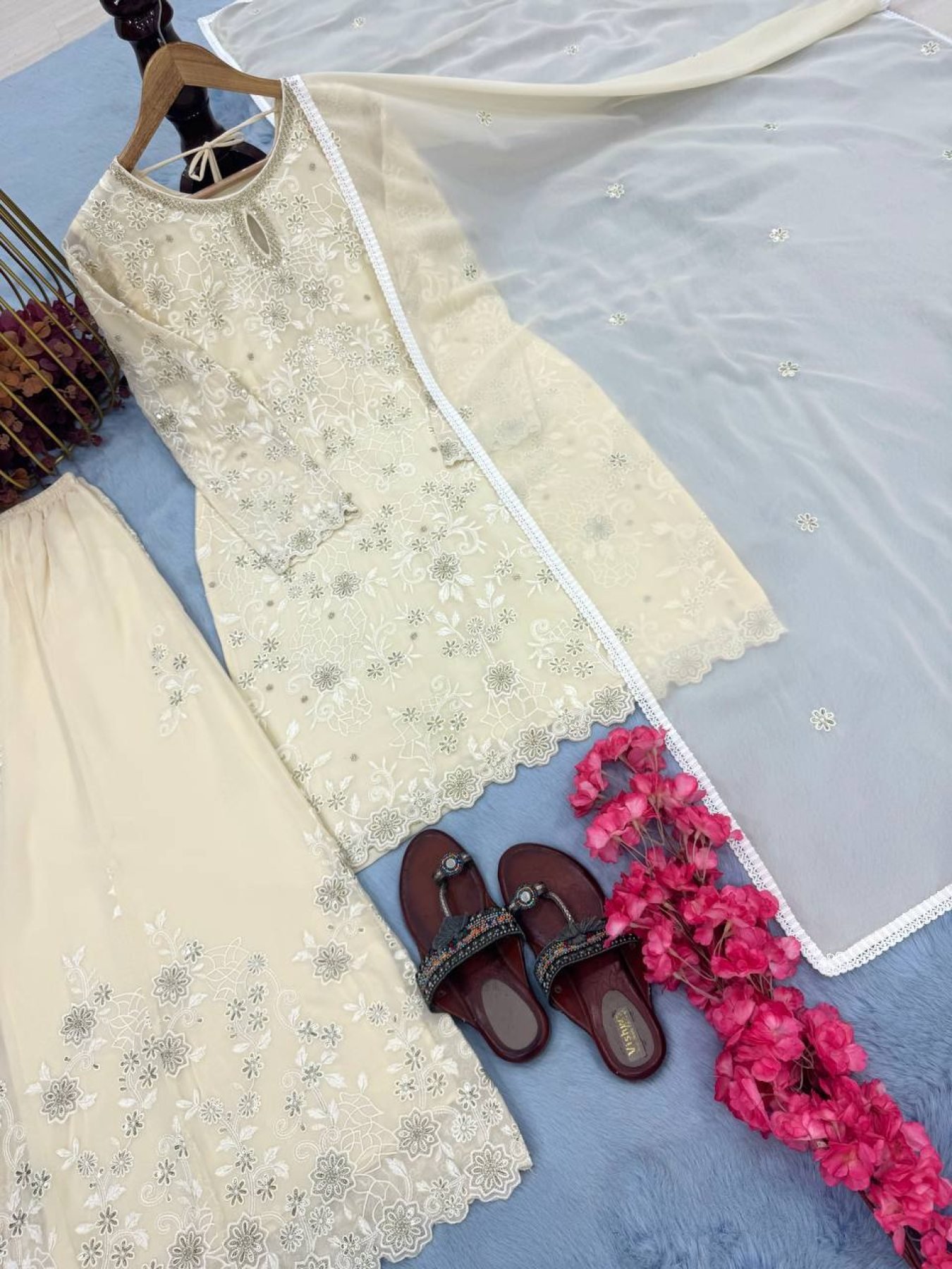 Unveil elegance with our latest party wear set crafted from heavy faux georgette. The top and palazzo feature rich 3mm sequin embroidery and intricate cutwork, paired with a beautifully bordered dupatta. Fully stitched and lined for comfort, this ready-to-wear ensemble is perfect for festive and wedding occasions.