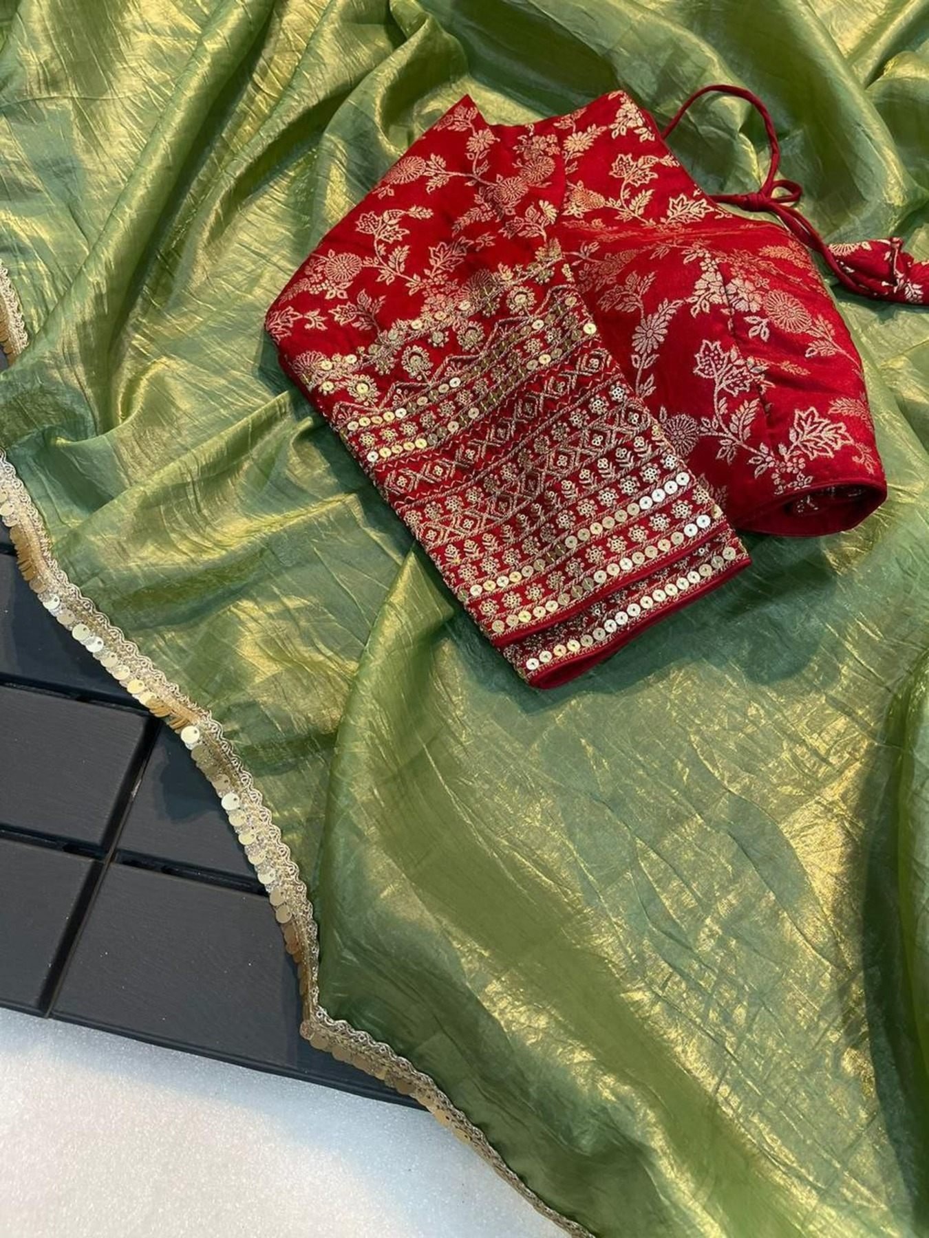 Blouse Fabric :- Dola Silk Banarsi Zari Sequence Thred Work With Stitch Blouse Up To 42 Size
