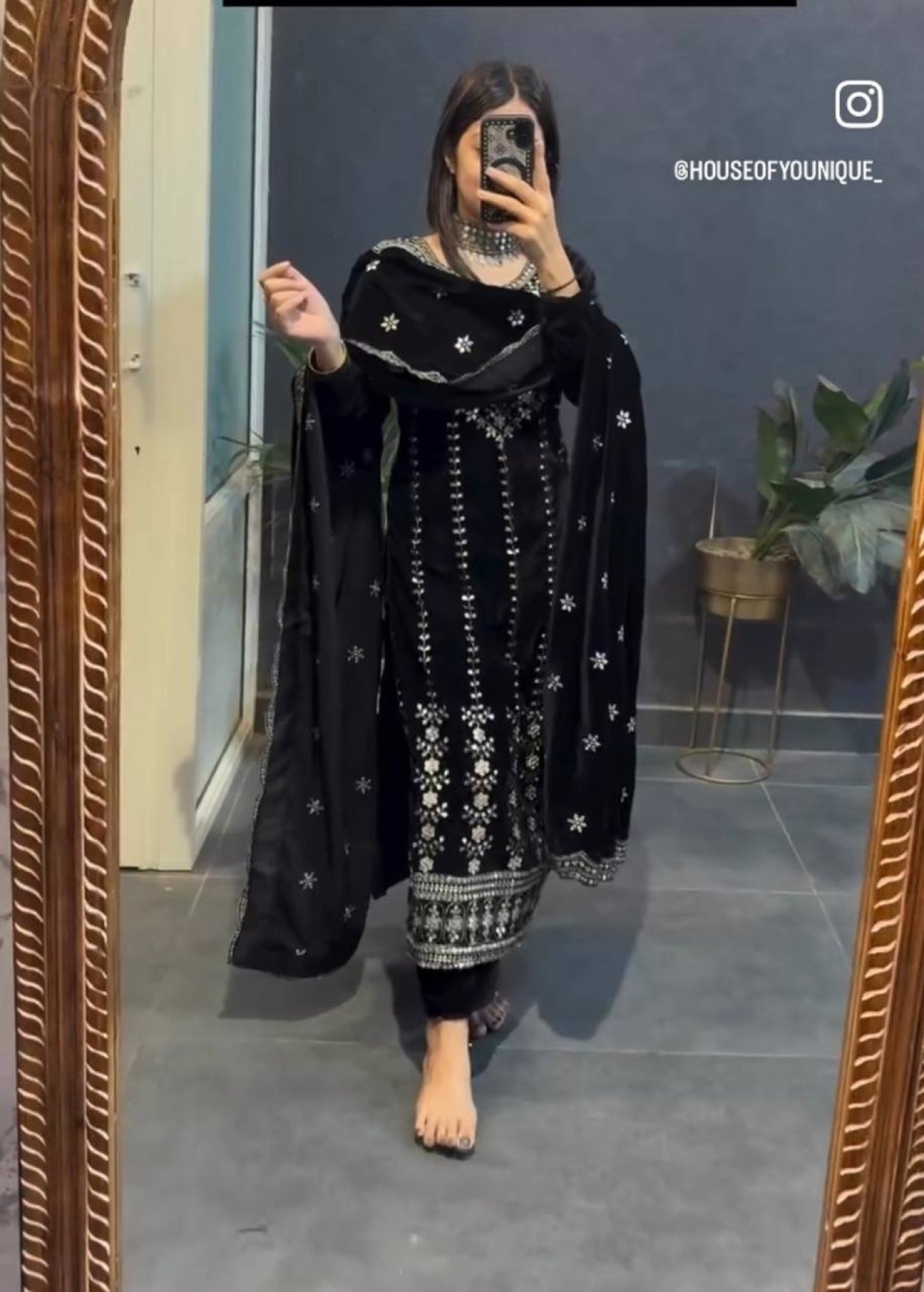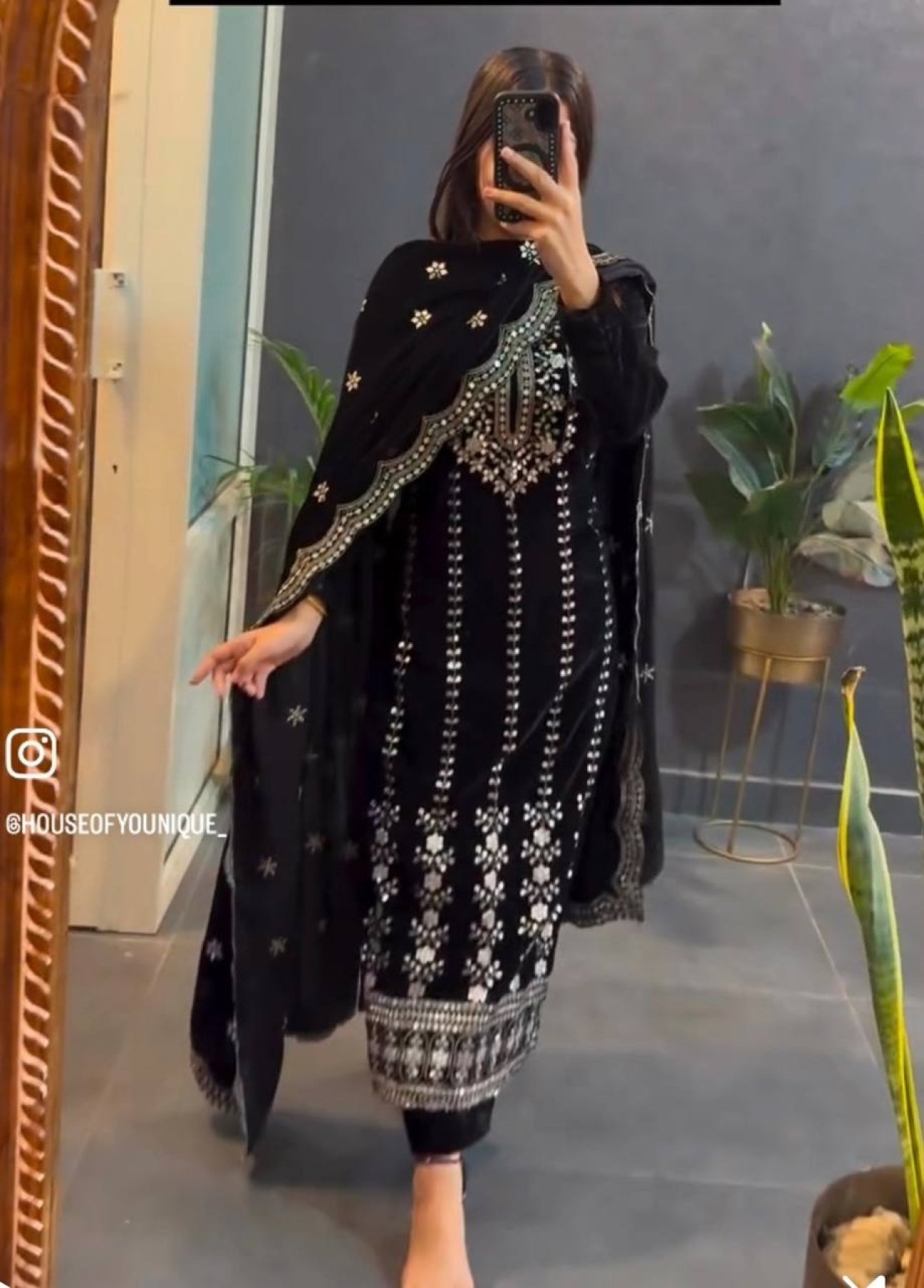 Designer Velvet Top-Pant Dupatta Set with Sequin Embroidery