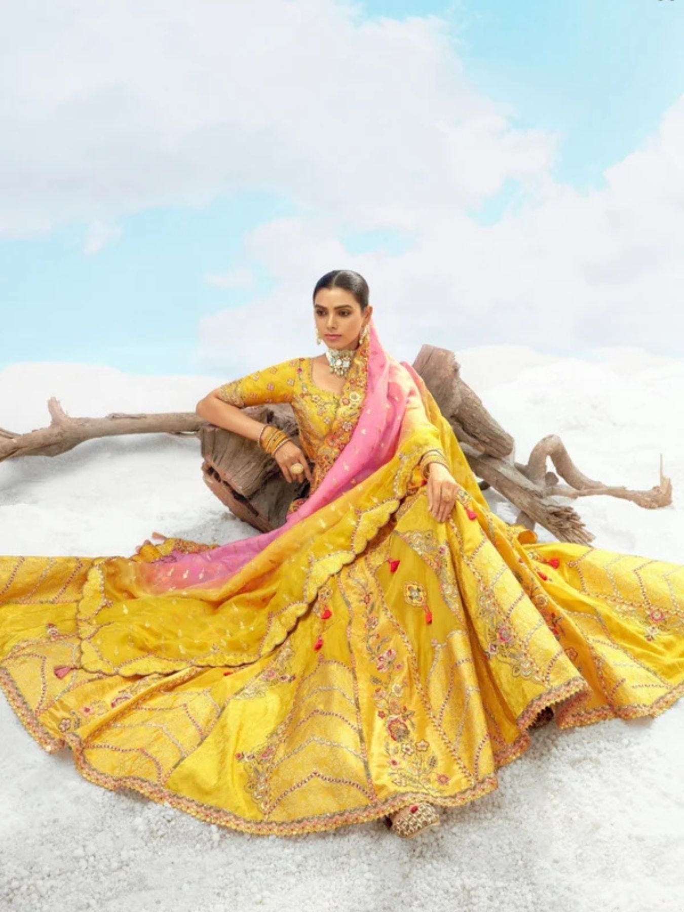 Designer Wedding Yellow Gold Bridal Lehenga Choli with Embroidery Cutwork Border