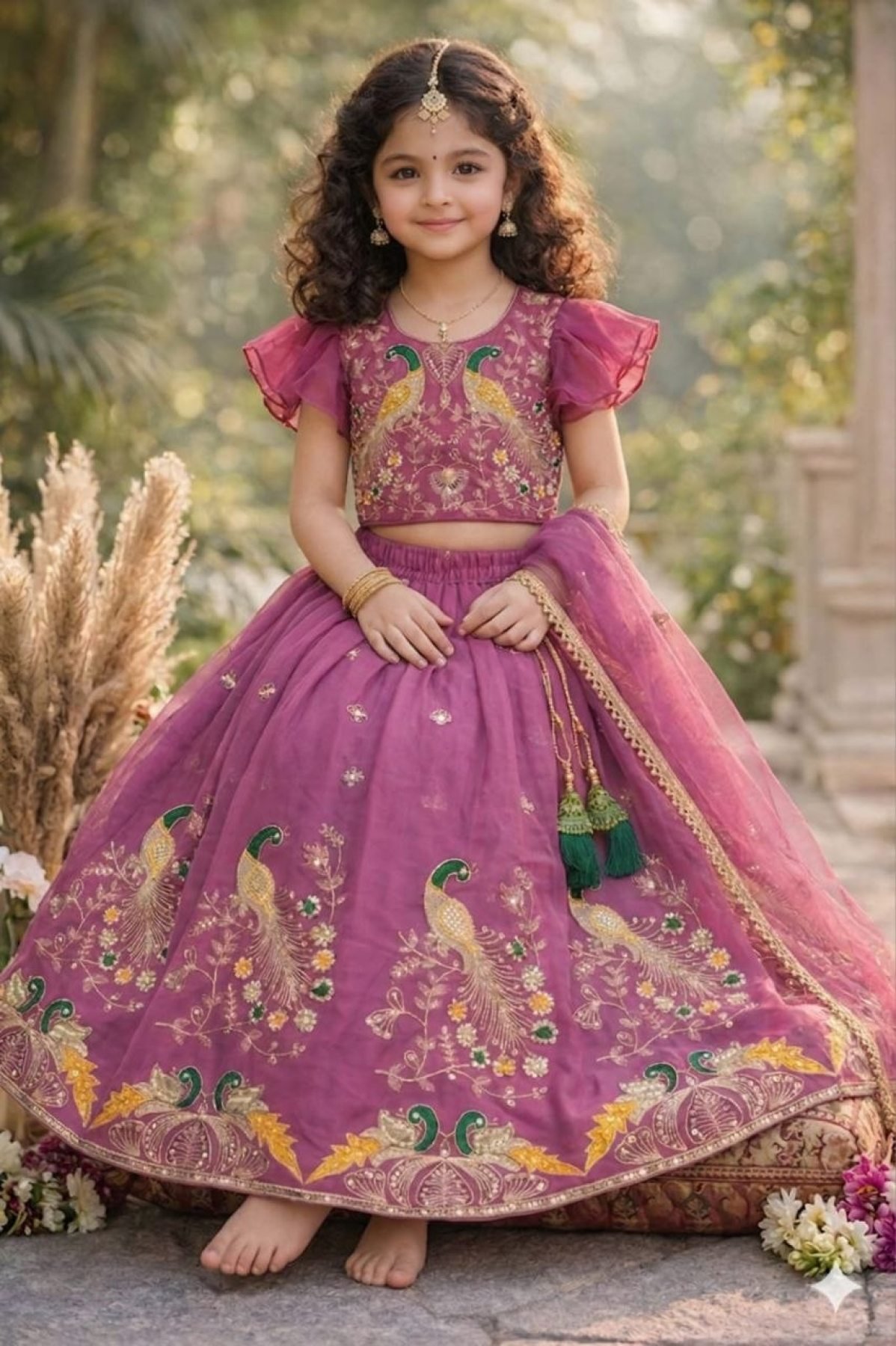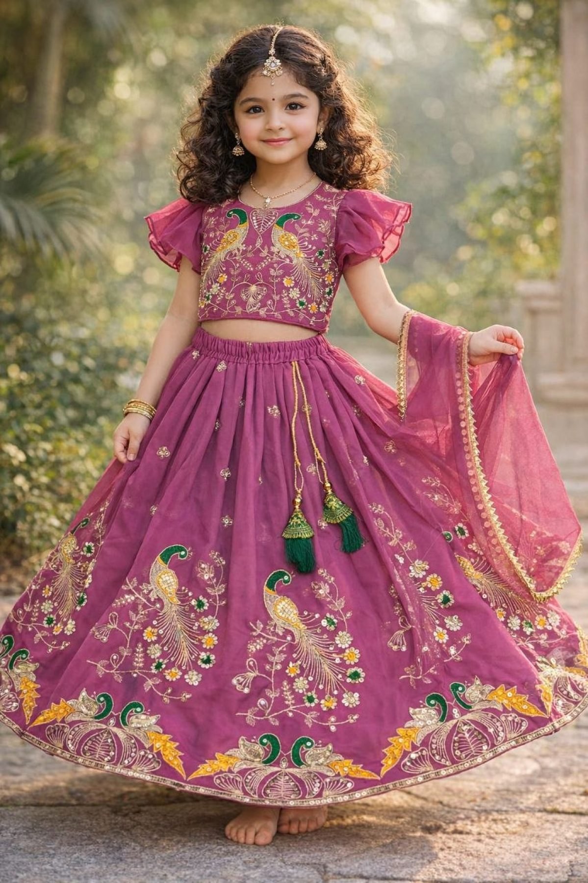 Beautiful kids lehenga choli set crafted in georgette featuring elegant multi embroidery work with a stylish net dupatta. Designed with soft lining and comfortable fit, this outfit is perfect for festive occasions, weddings, and celebrations.