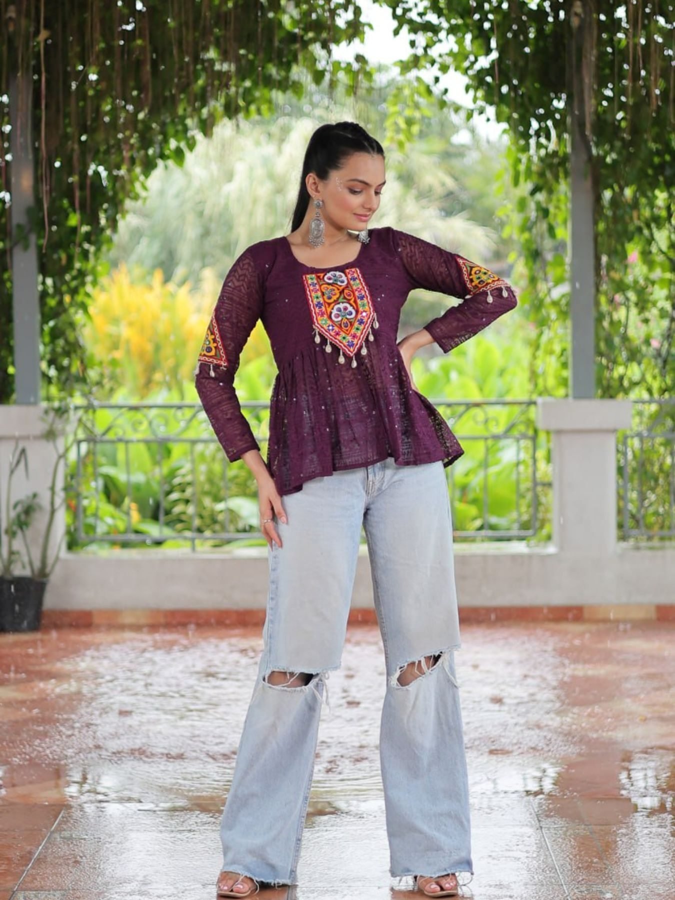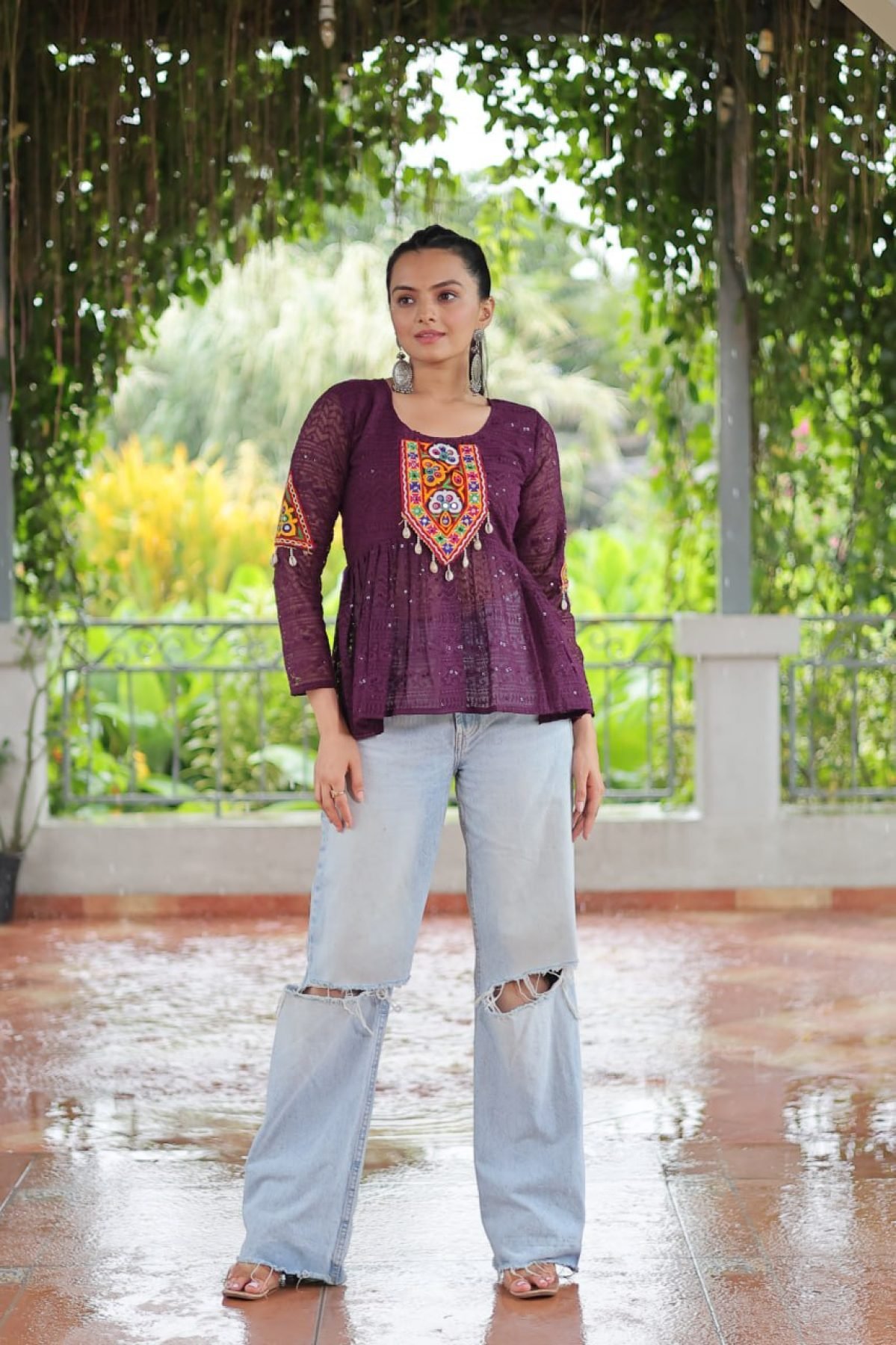 Designer Wine Schiffli Top with Real Mirror Gamthi Patch Best Festive Look