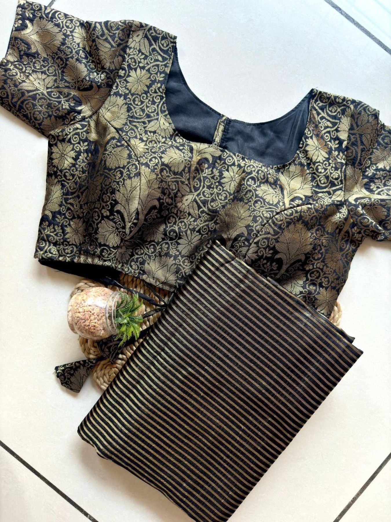 Our bestselling catalogue is back in a brand-new stunning black color! Crafted in pure soft organza with elegant golden zari stripes, this saree exudes timeless charm. Comes paired with a premium brocade jacquard blouse for a graceful festive and party wear look.