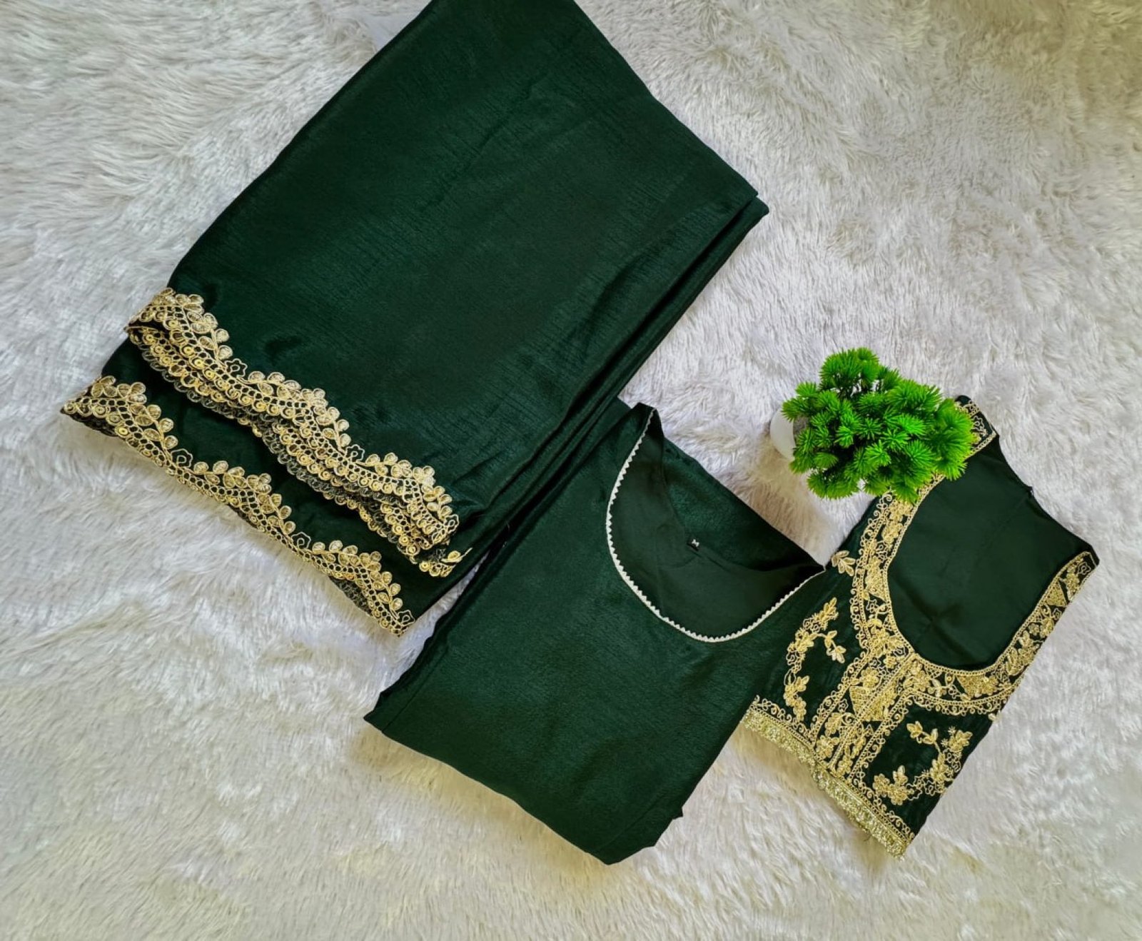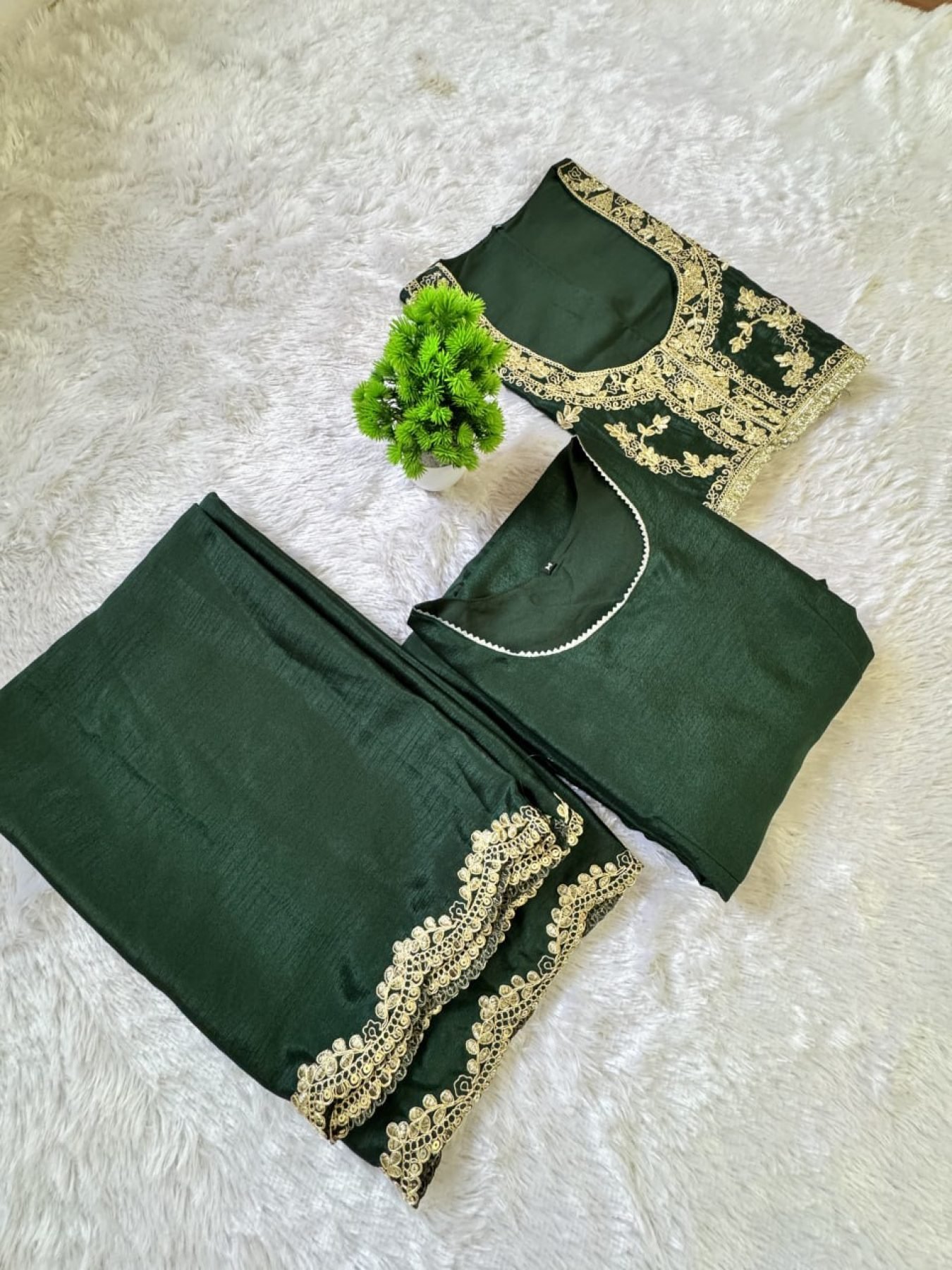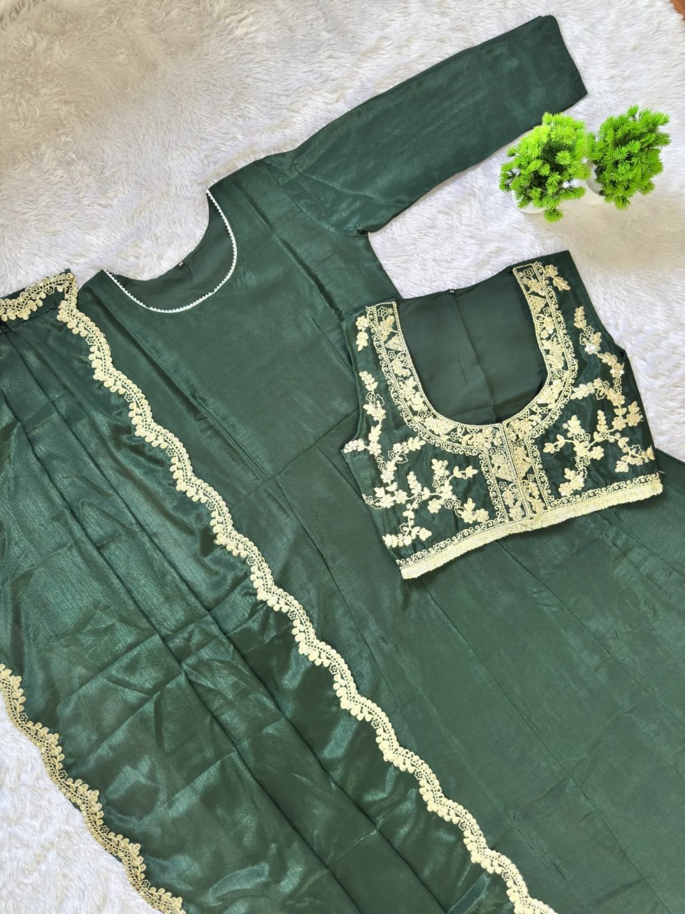 Elegant green chinon silk gown set featuring rich sequins embroidery, paired with a stylish koti and matching dupatta with lace border. Perfect for festive wear, party occasions, and wedding functions.