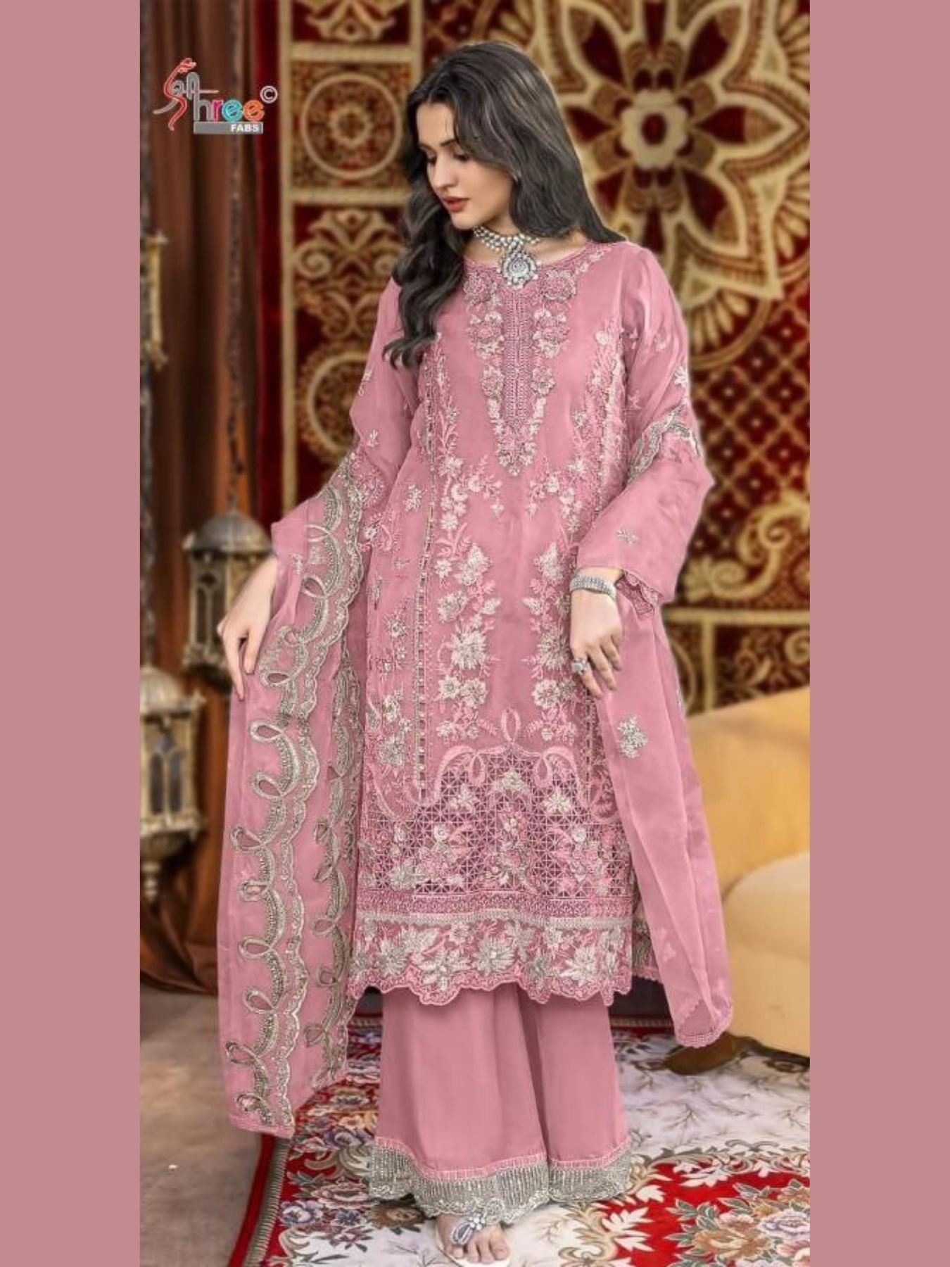 Shree Designer D.No. K 5344 is a luxurious partywear suit crafted in heavy dinting chiffon with intricate hand khatli embroidery. Paired with a smooth santoon dull inner and an embroidered chiffon dupatta, this set is ideal for festive occasions, boutiques, and wholesale buyers seeking premium quality at manufacturer pricing.
