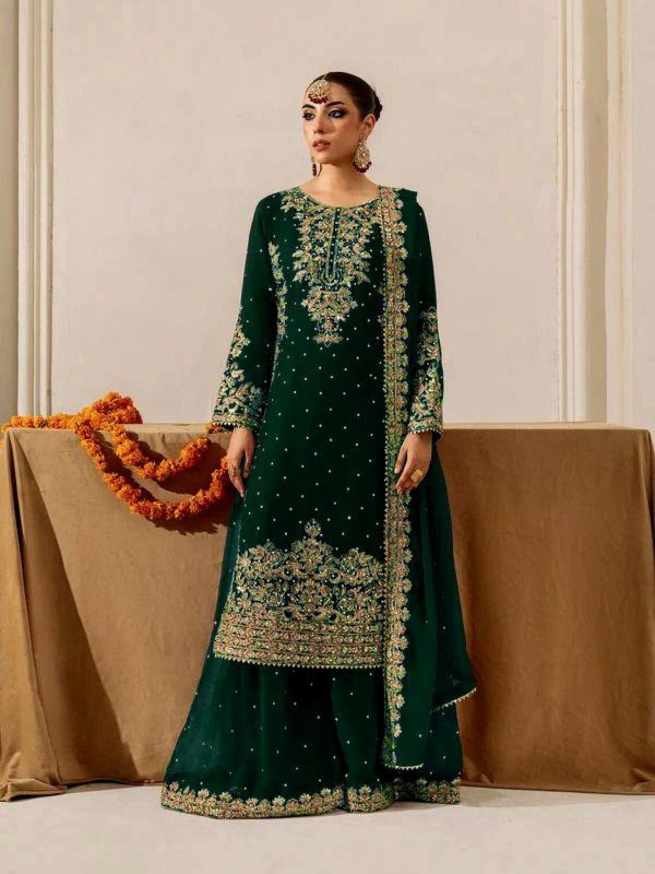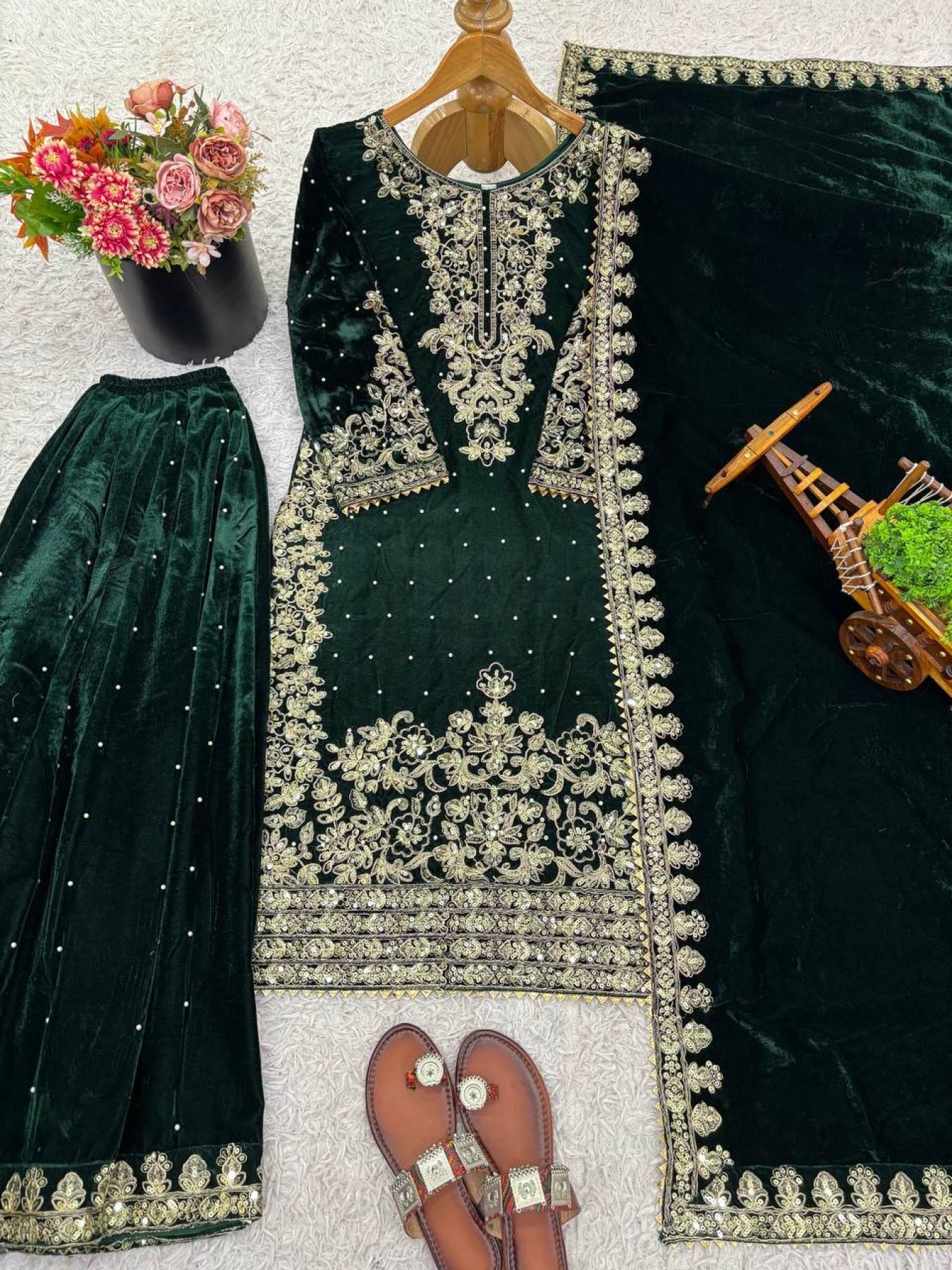 Divine Green Fully Stitched Velvet Suit with Coding Sequence Work for Wedding Wear