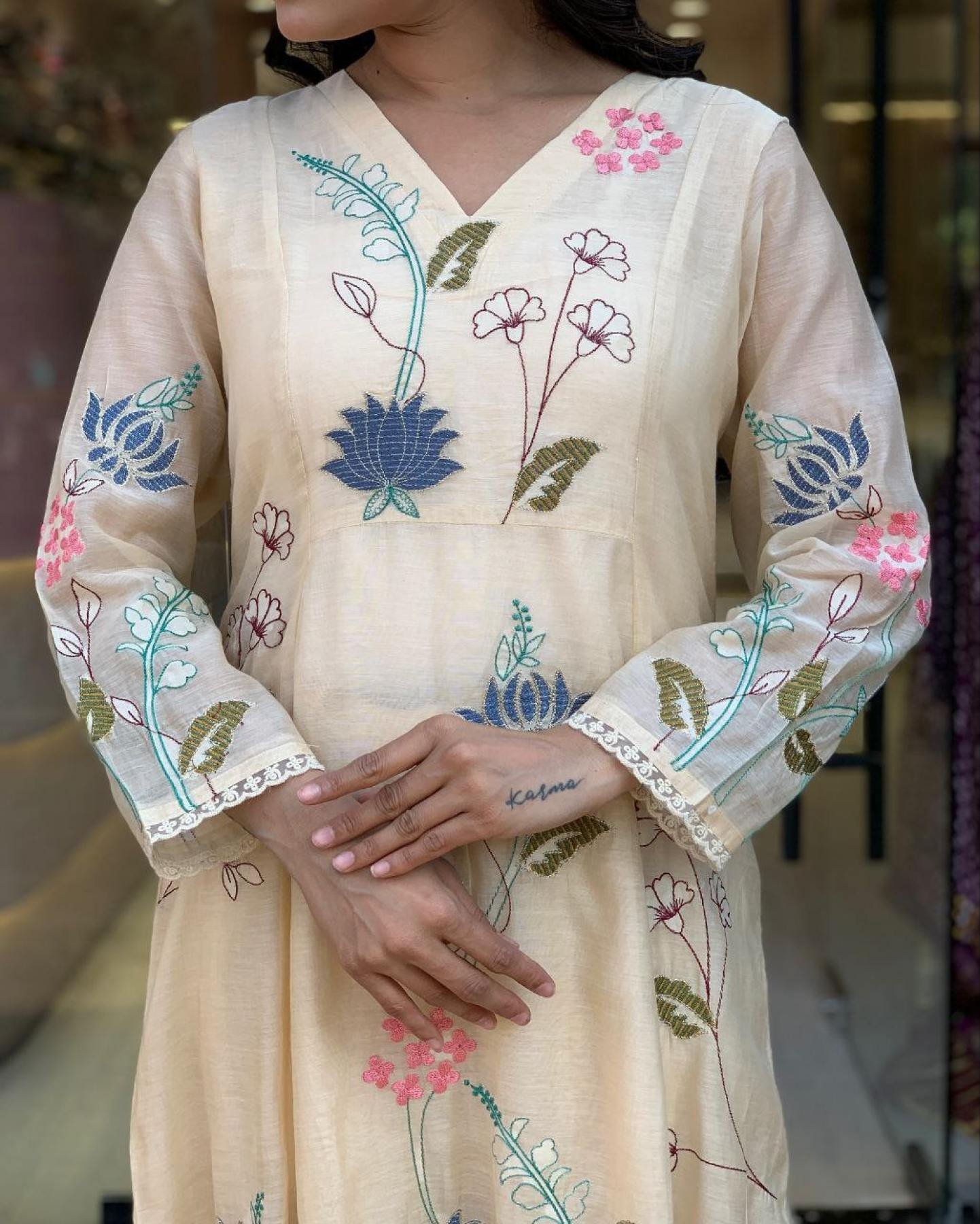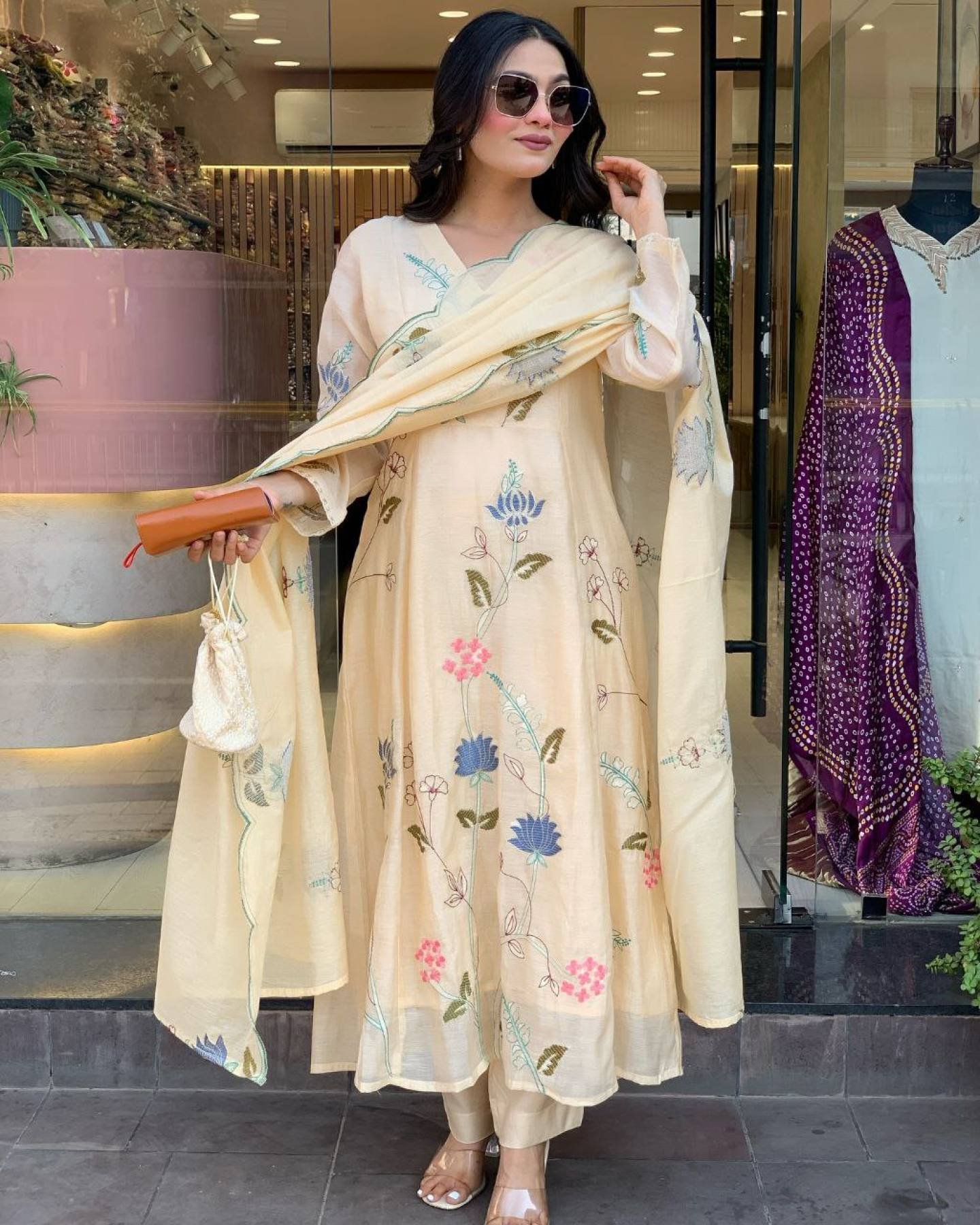 Crafted in luxurious viscose chanderi fabric, this A-line kurta set features elegant embroidery for a rich festive appeal. Paired with a matching embroidered dupatta, this set is perfect for weddings, parties, and festive collections. Available in wholesale at the best rates directly from the manufacturer.