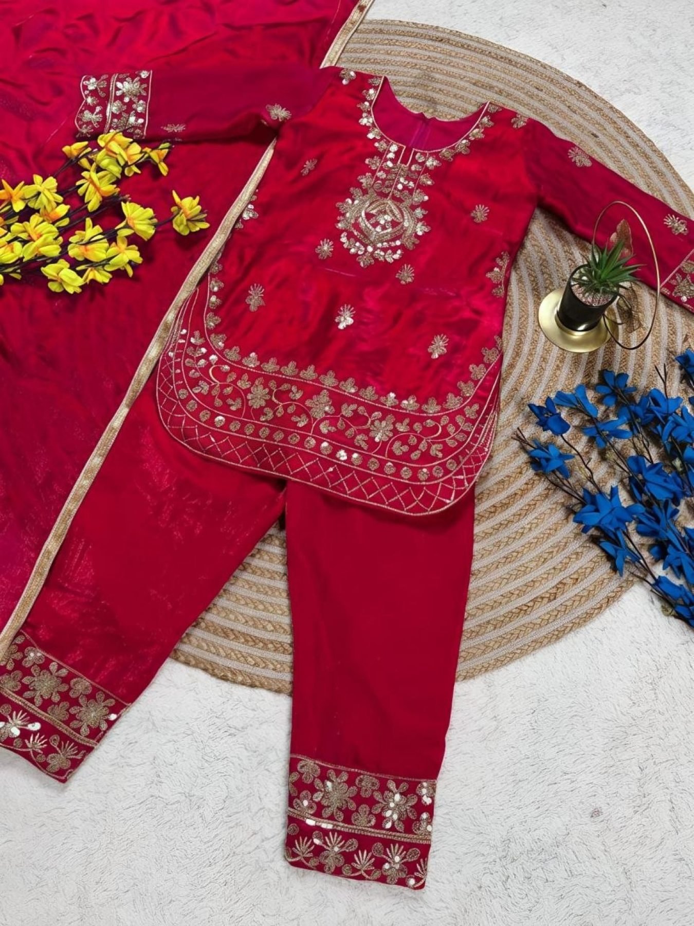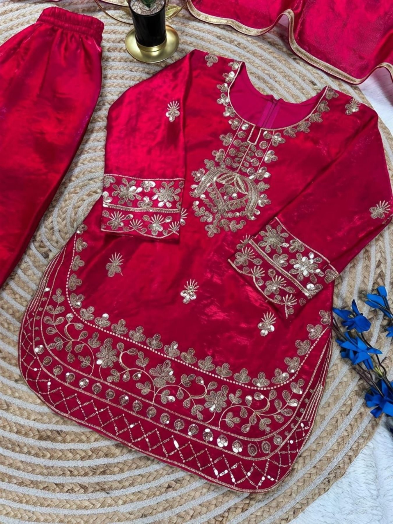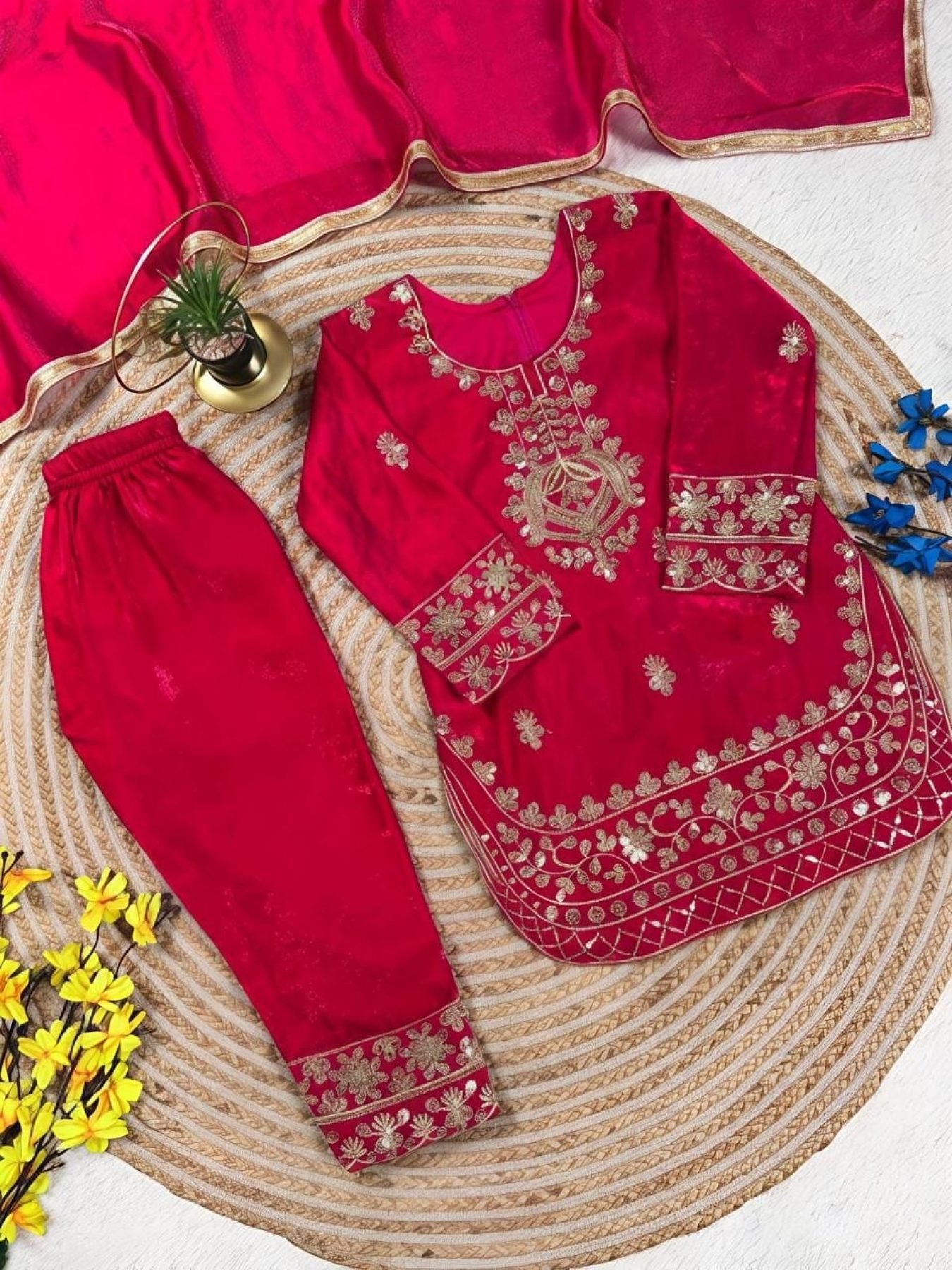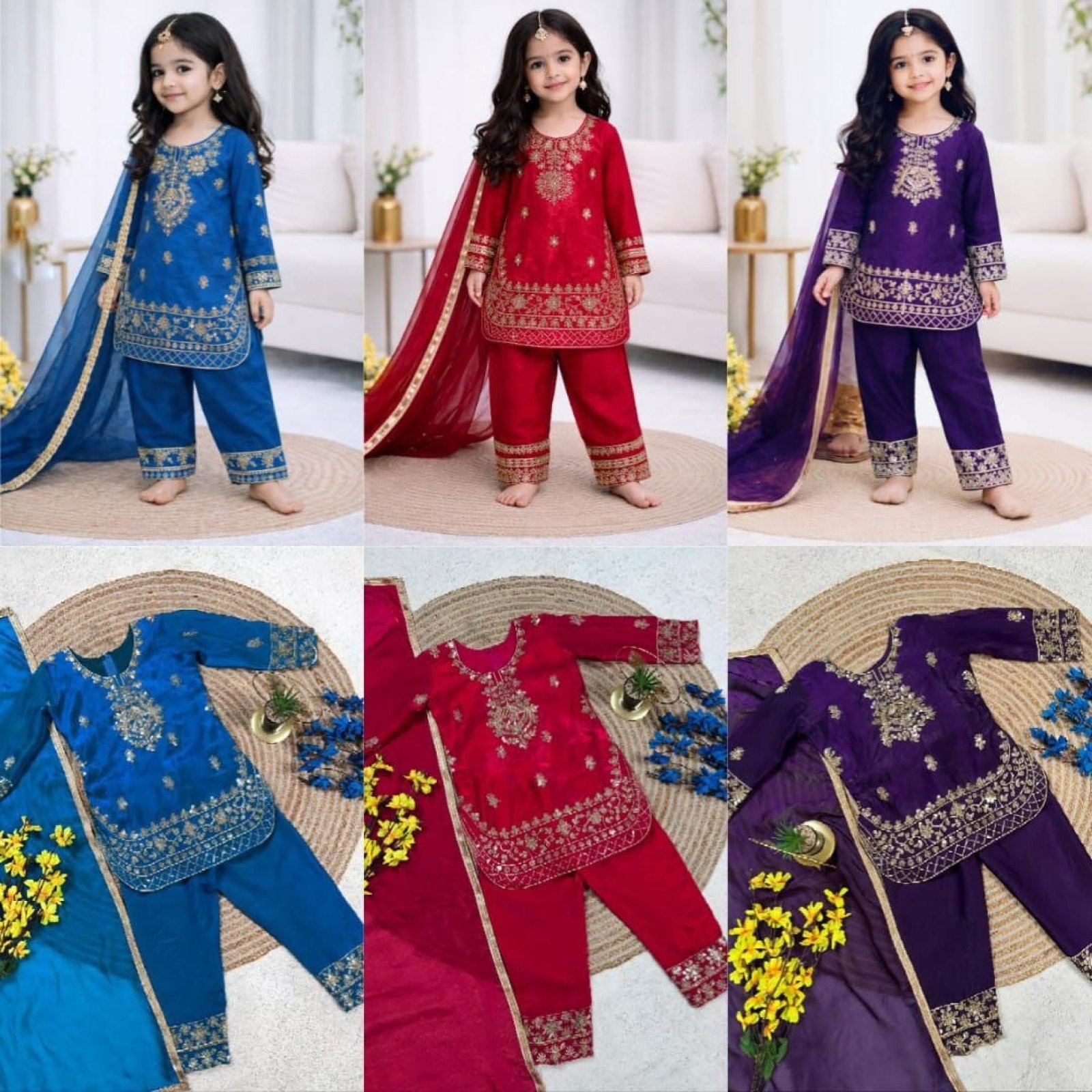 Elegant kids festive set crafted in premium GMY silk featuring embroidery sequence work. Designed with a comfortable fit and paired with palazzo and dupatta, this outfit is perfect for Ramzan, Eid celebrations, and festive occasions.