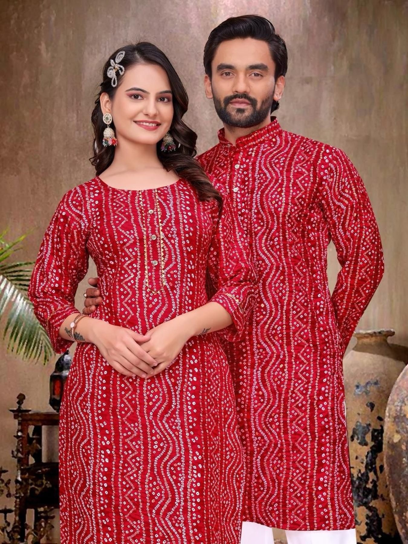 Stylish matching couple combo set crafted in soft rayon featuring elegant bandhani foil print. Designed for comfort and coordinated style, this set is perfect for festive wear, weddings, and traditional occasions.