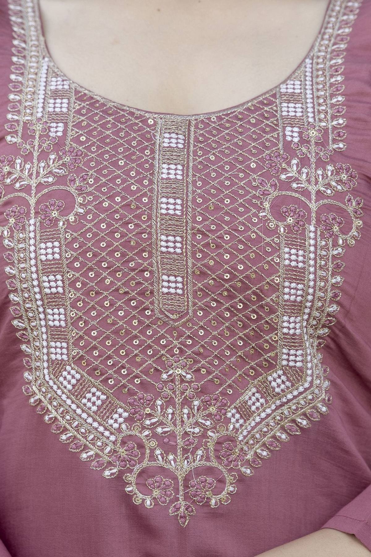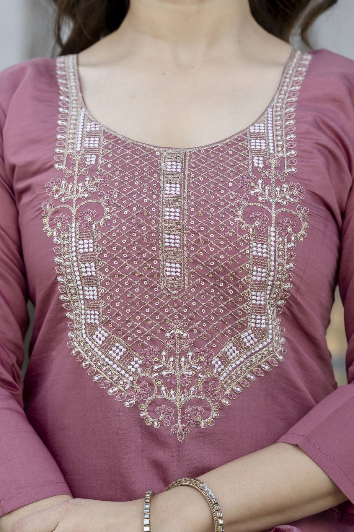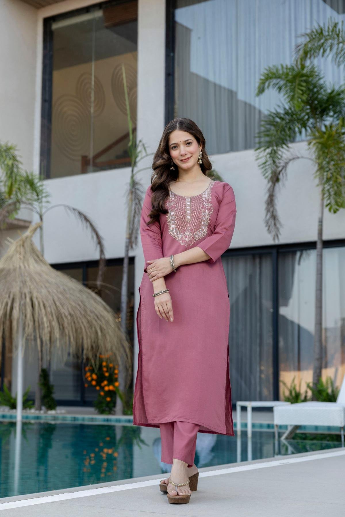 Dusty Pink Chanderi Fabric Embroidered Straight Kurta Set For Woman