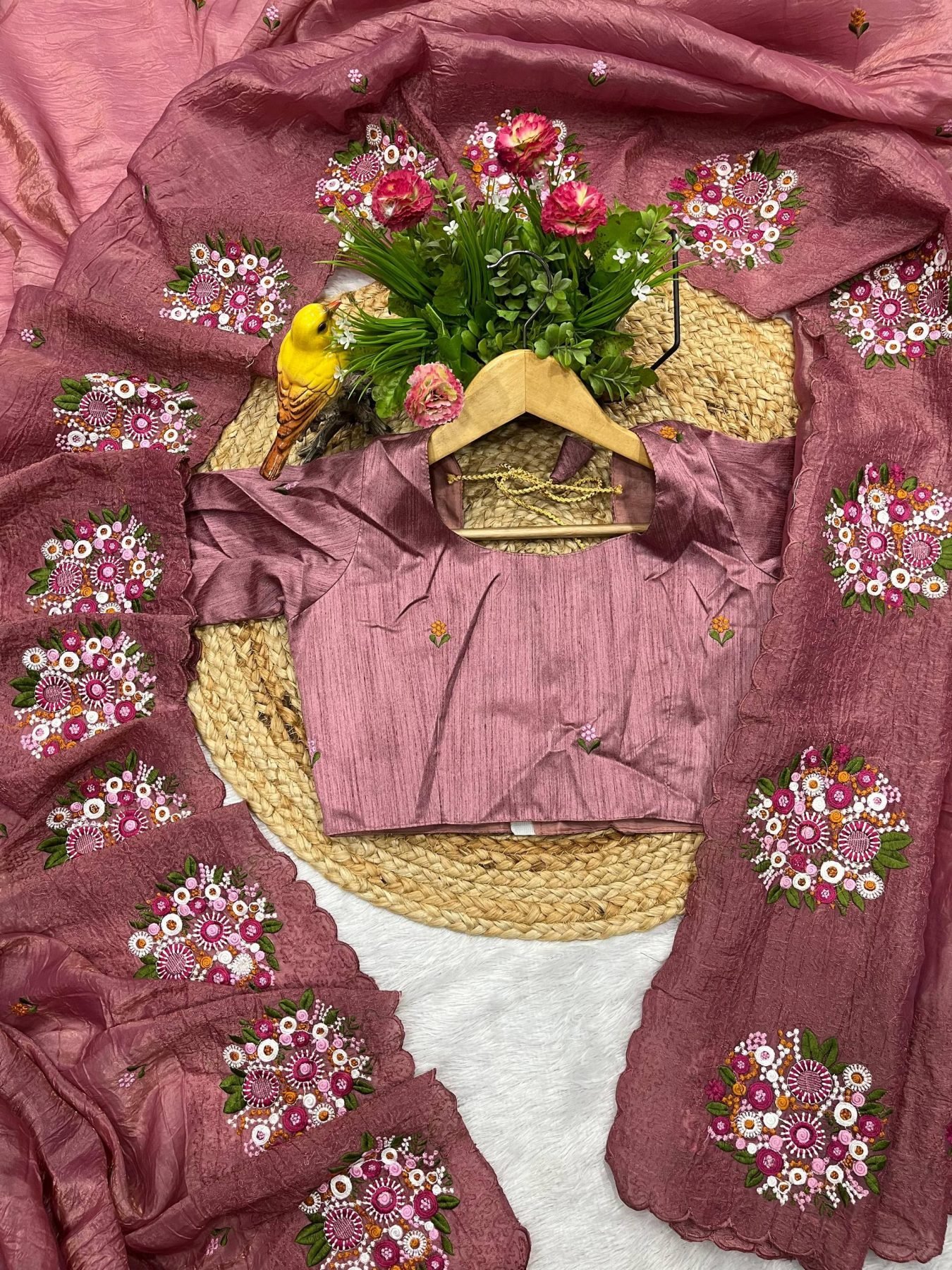 Dusty Pink Gold Crush Saree with Colorful Floral Thread Work for Festive Ready