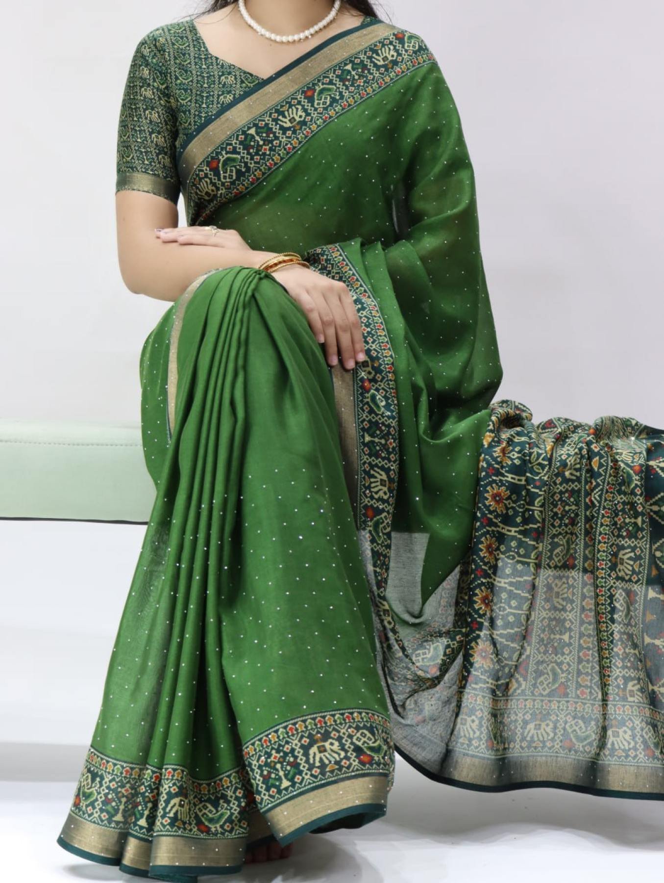 Dynamic Green Mull Cotton Patola Print Saree with Sirovski Diamond And Zari Border