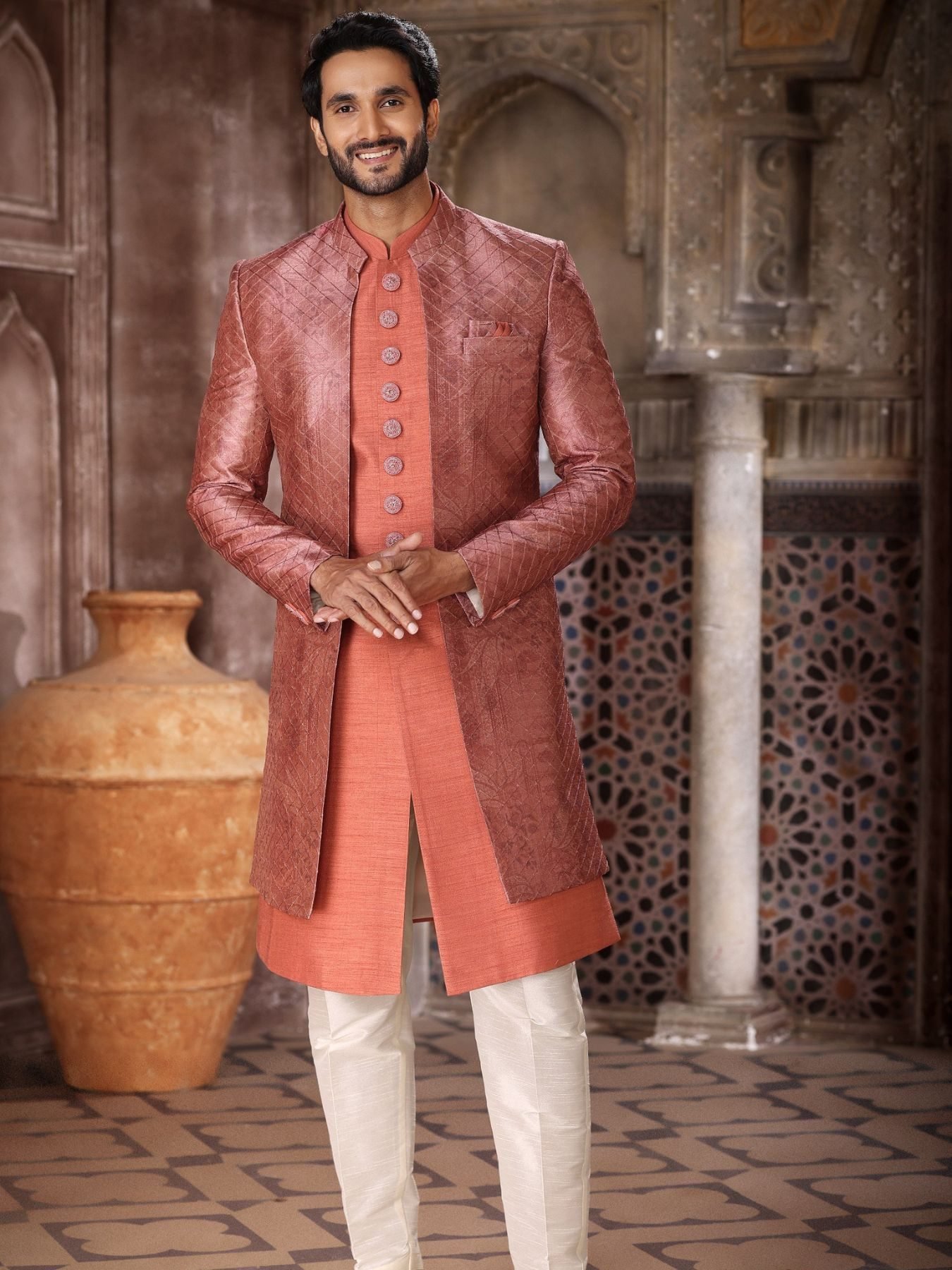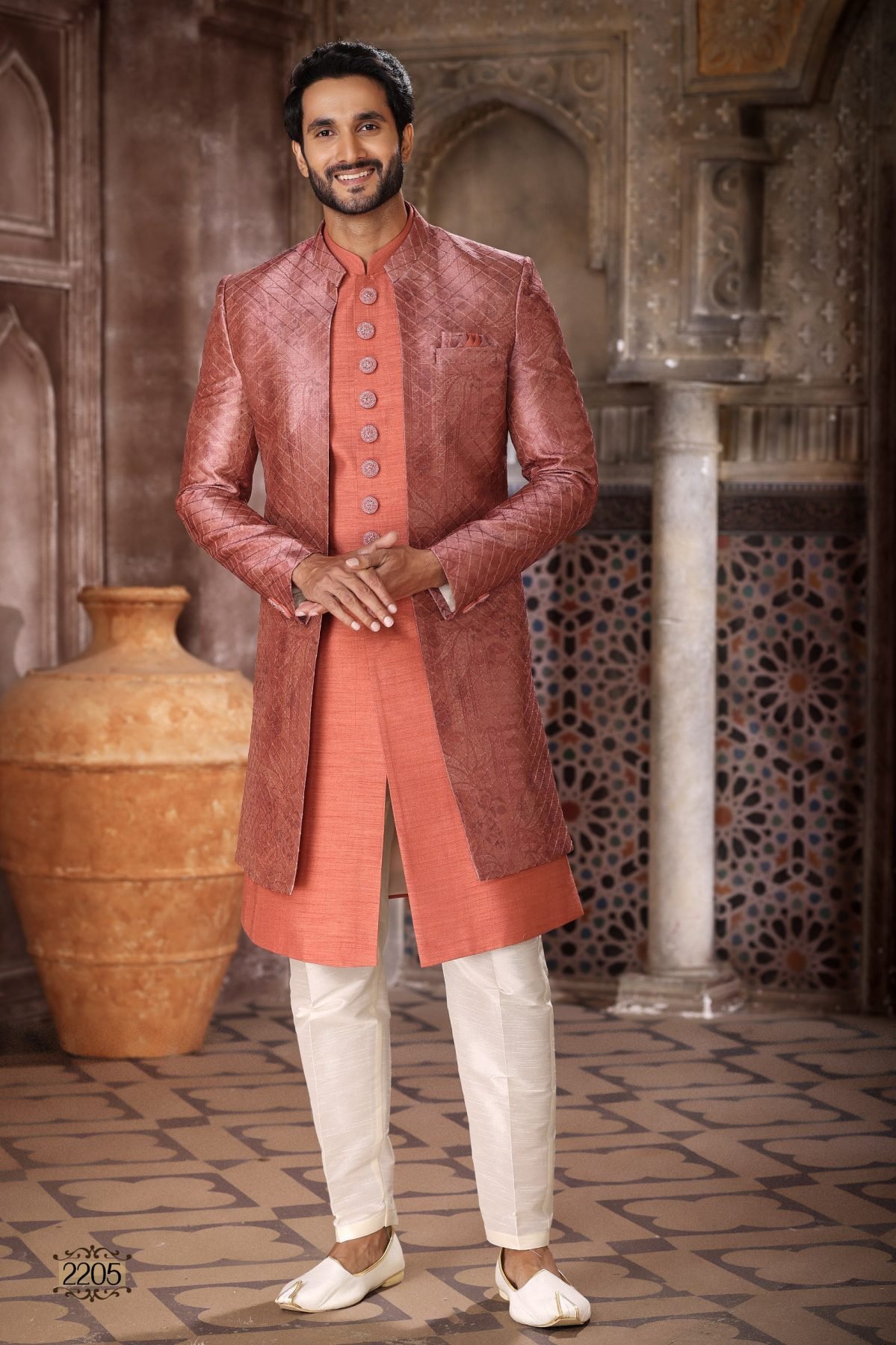 Premium 3 piece indo western jacket set crafted in art silk, velvet and banarasi jacquard fabrics with multiple designer variants. Comes with stylish jacket, kurta and aligarhi pant, perfect for wedding and festive wear.