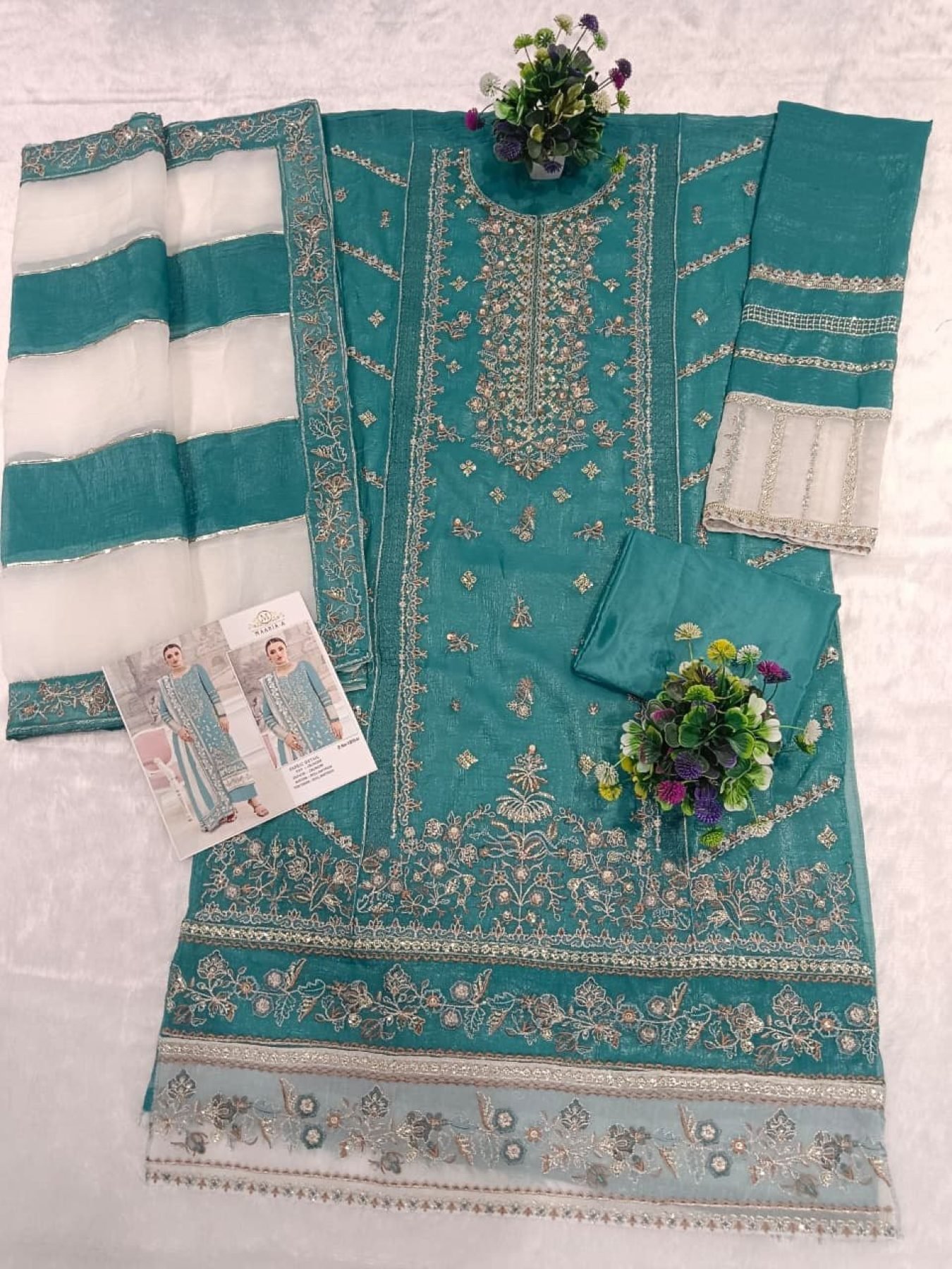 Premium crunchy fabric suit set featuring heavy embroidery sequence and khatli work, paired with santoon bottom and elegant lace dupatta. Available in material and readymade options, perfect for wedding, festive, and party wear.