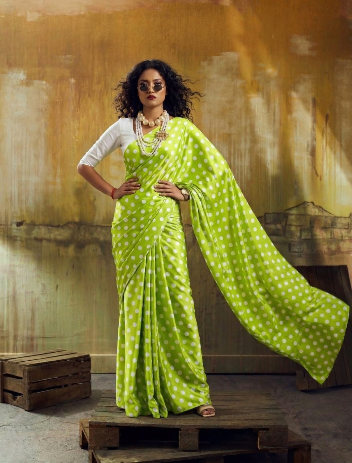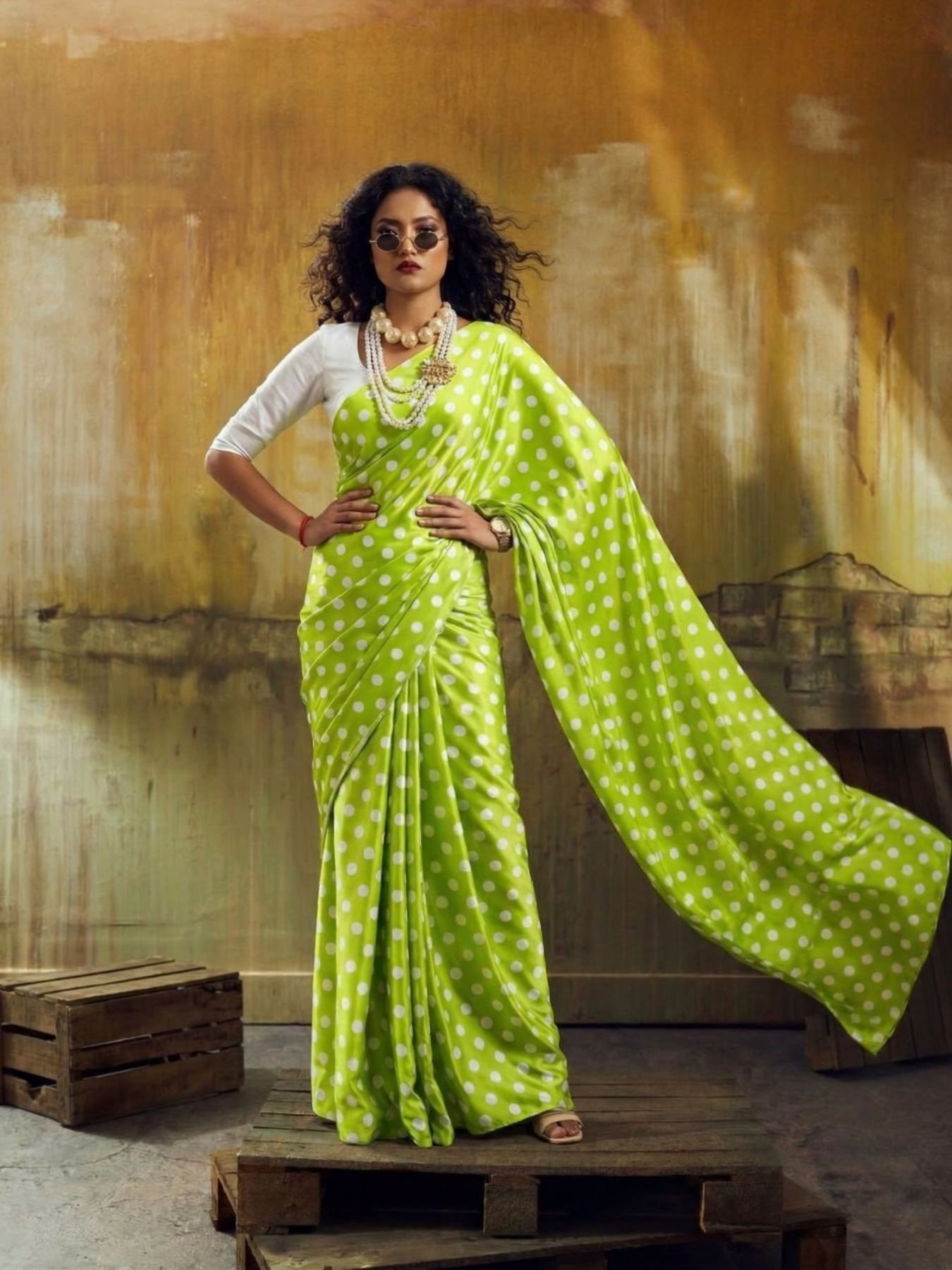 Effortless Green Japan Satin Saree with Polka Dot Print for Women