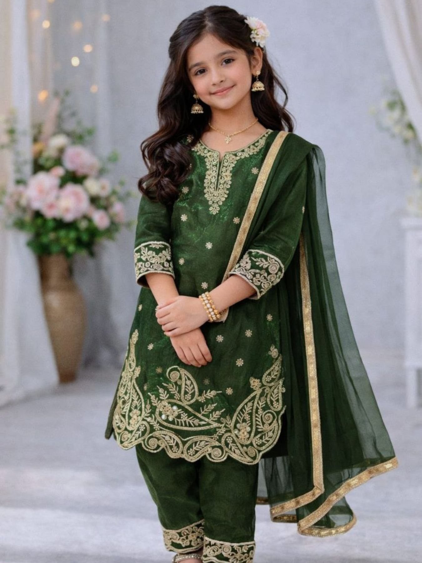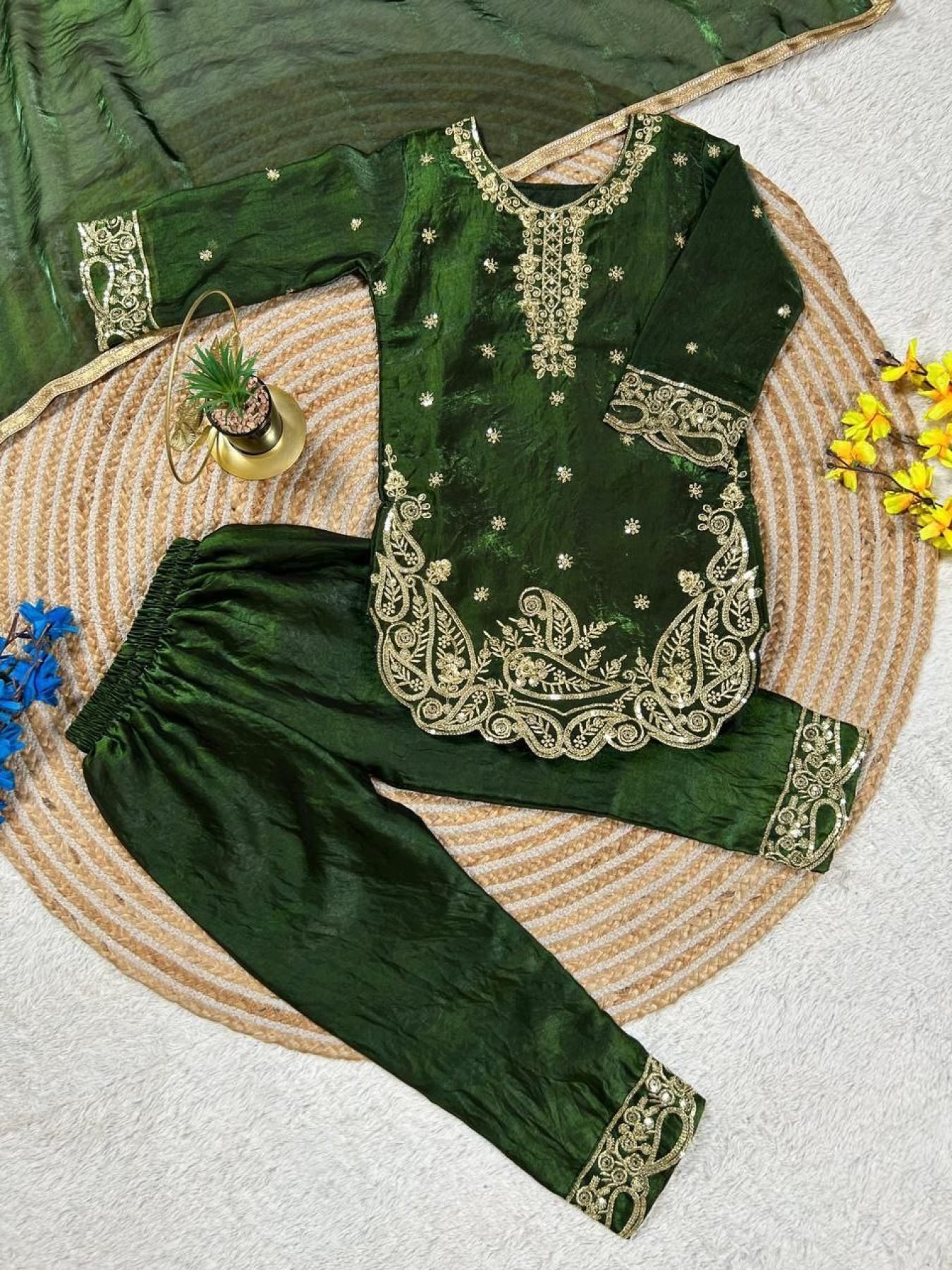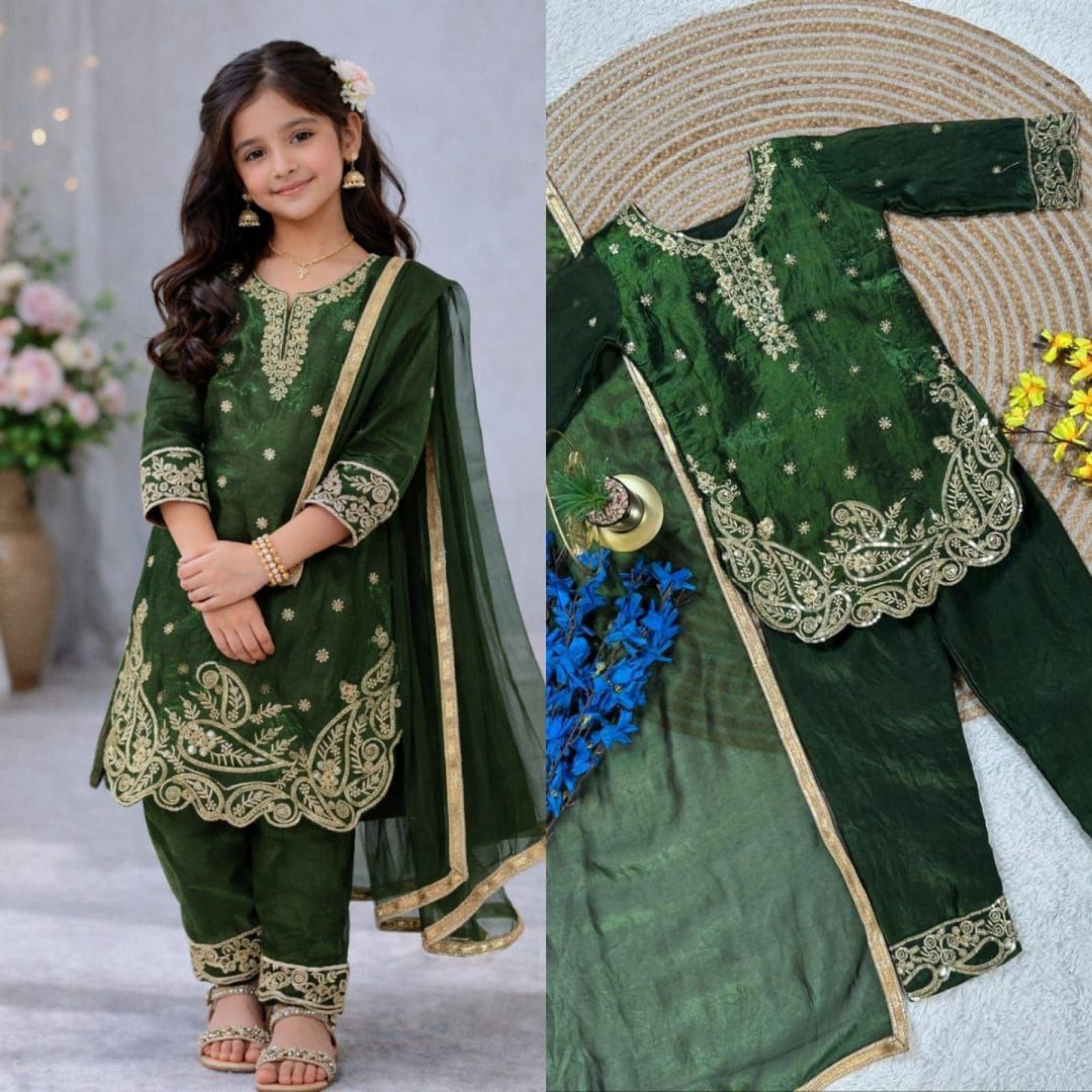 Elegant kids top palazzo set crafted in premium GMY silk featuring embroidery sequence work. Comes with a stylish dupatta, perfect for Ramzan, Eid celebrations, and festive occasions.