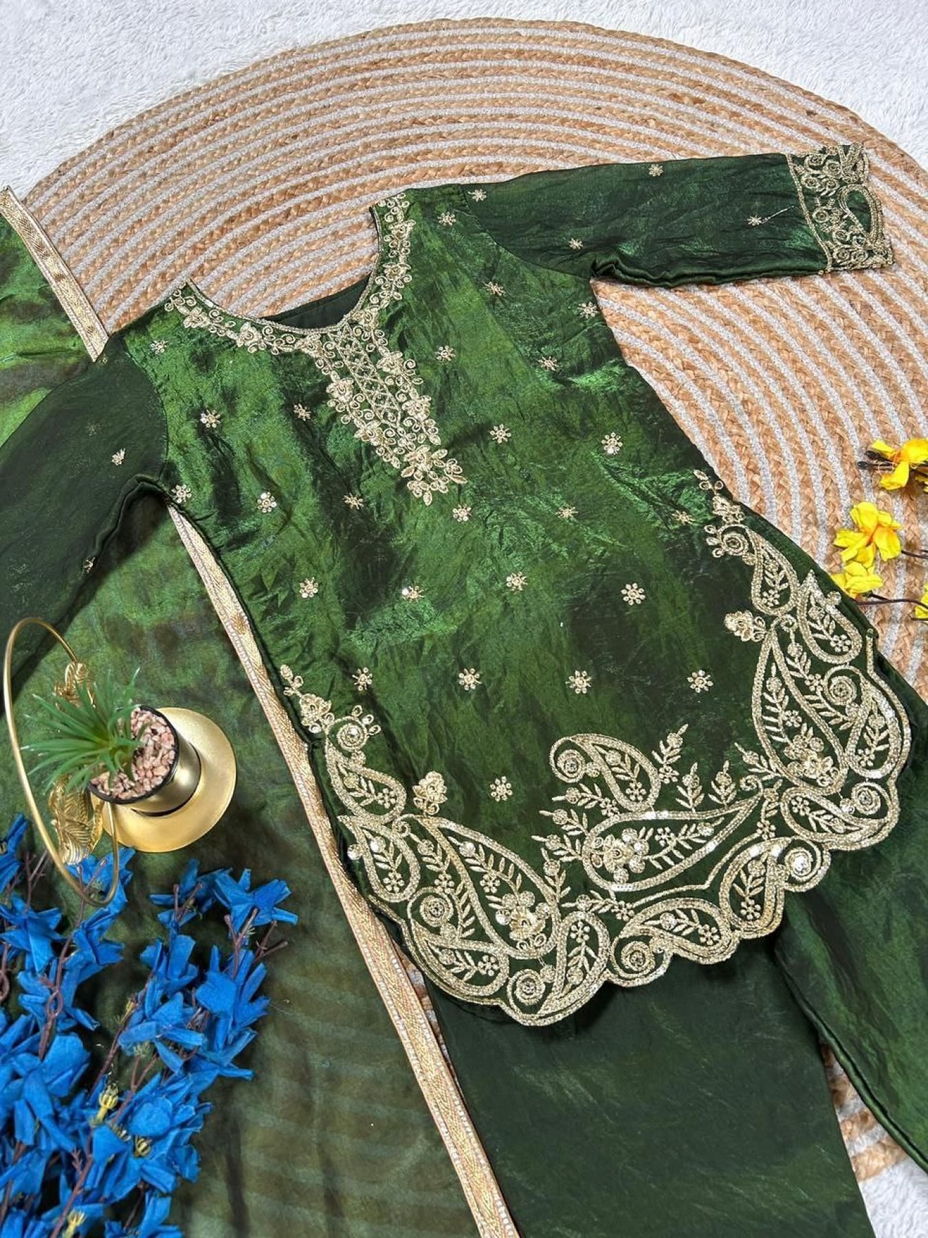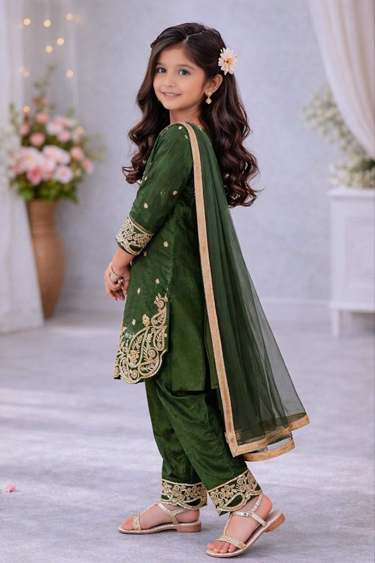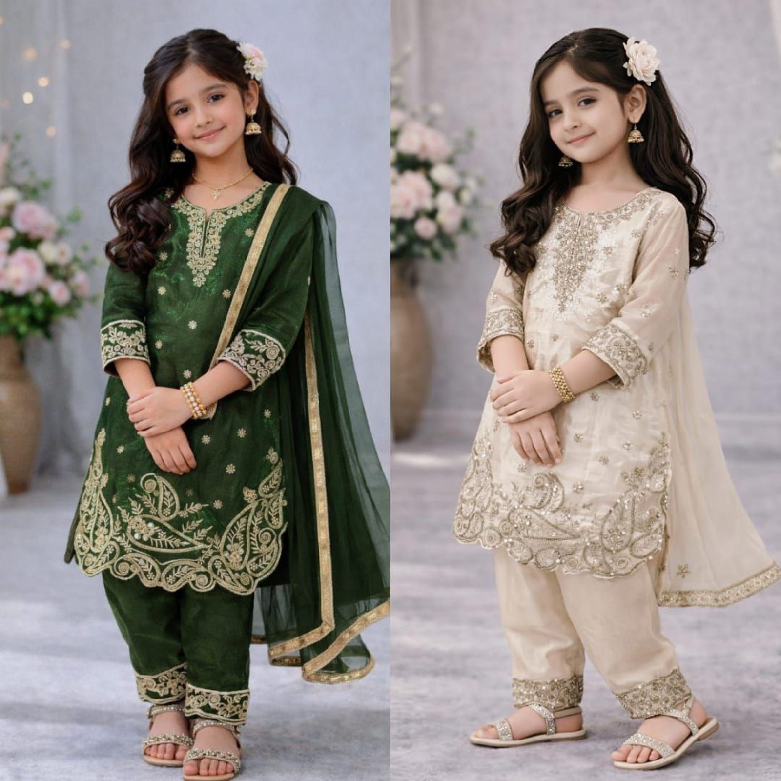 Elegant kids top palazzo set crafted in premium GMY silk featuring embroidery sequence work. Comes with a stylish dupatta, perfect for Ramzan, Eid celebrations, and festive occasions.