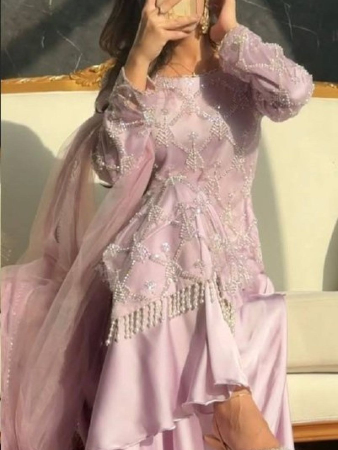Top Work: Heavy embroidery sequence work with fancy pearl moti and lace border
