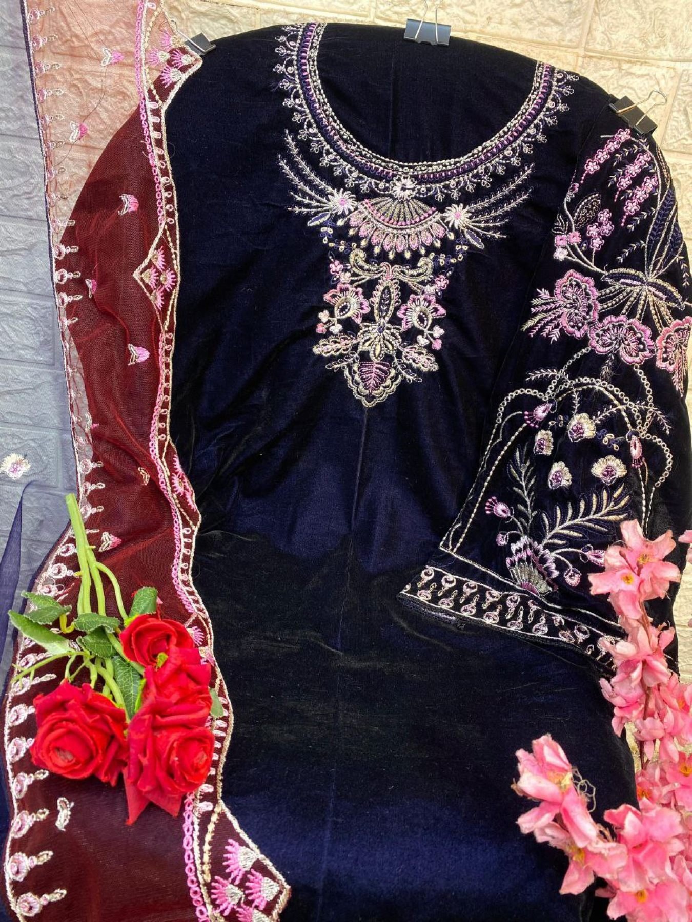 The matching velvet bottom comes with self-embroidery for a rich coordinated style.