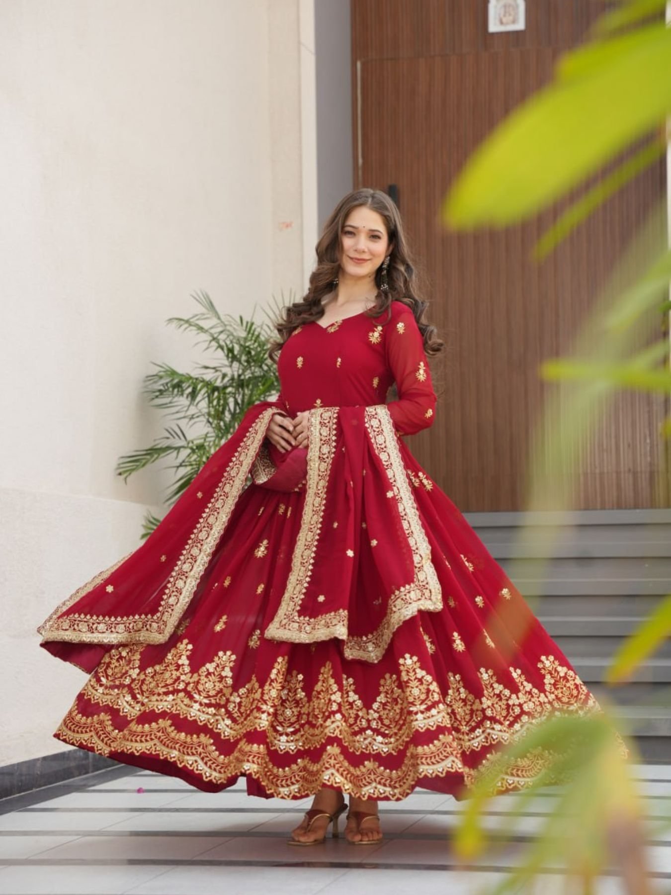Elegant Maroon Zari Sequins Faux Blooming Gown Set with 3 Mtr Flair Fancy V Neck with Embroidered Dupatta for Party Wear