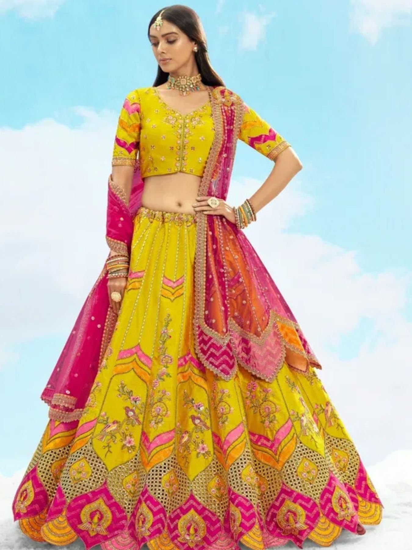 Elegant Mustard Yellow Embroidered Silk Lehenga Choli For Wedding