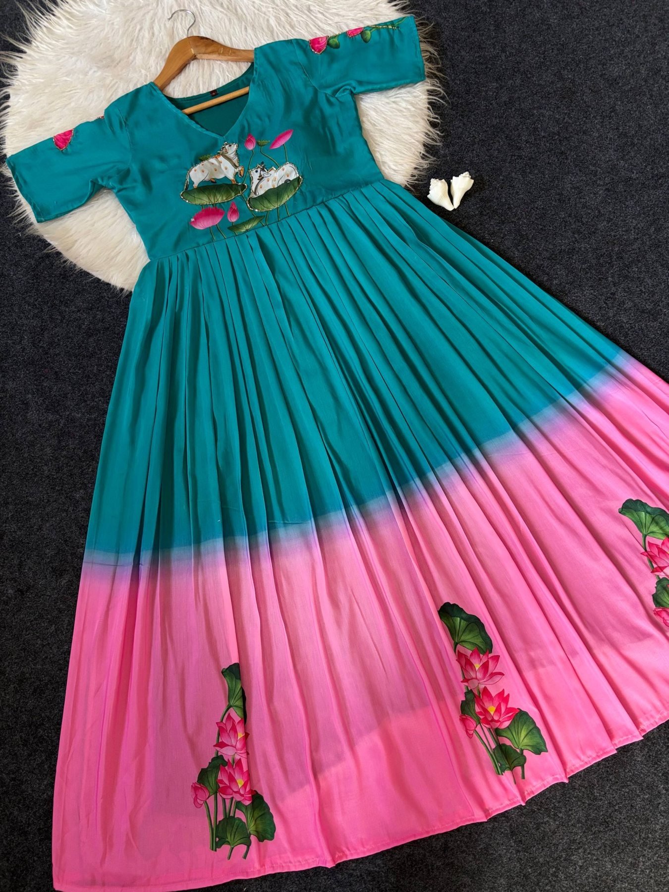 gown crafted in premium Maslin fabric featuring a beautiful South style pattern print with detailed Khatli handwork. Designed with a comfortable micro cotton inner and a graceful silhouette, making it perfect for festive occasions, casual gatherings, and boutique collections.