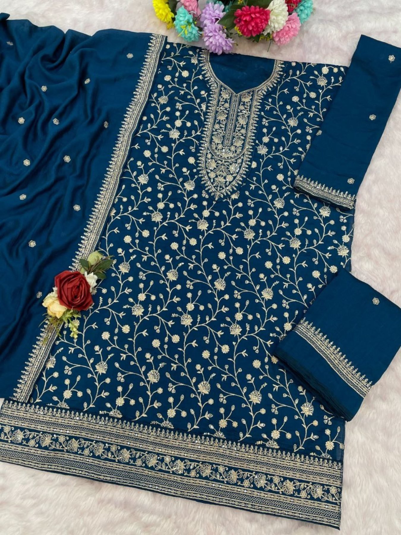 This premium suit set comes in rich Fancy Blooming Vichitra fabric with heavy embroidery and 3mm sequence work for a luxurious festive look.