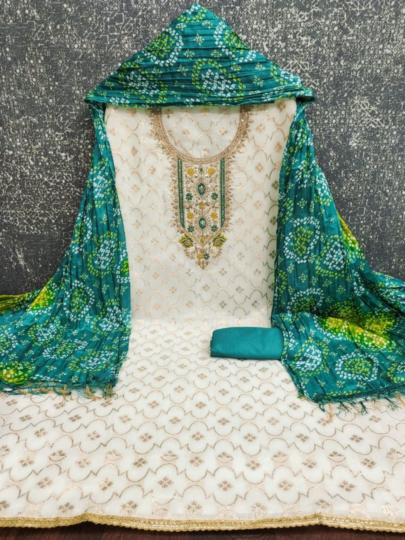 Affordable chanderi jacquard dress material with sequins work top, santoon bottom, and printed chinon dupatta. Ideal for festive and daily ethnic wear.