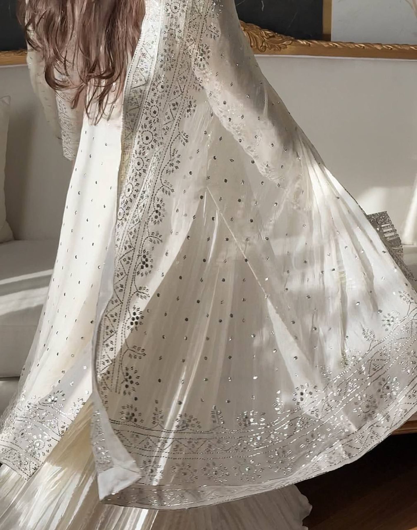 Presenting a graceful Pakistani-style straight cut stitched dress set in an elegant white color, crafted from pure Fox Georgette fabric. Designed with 5 mm sequin embroidery on the top and dupatta and detailed cross work on the sharara, this outfit delivers a refined festive and party-wear look. An excellent choice for wholesalers, resellers, and boutique collections.Product Details