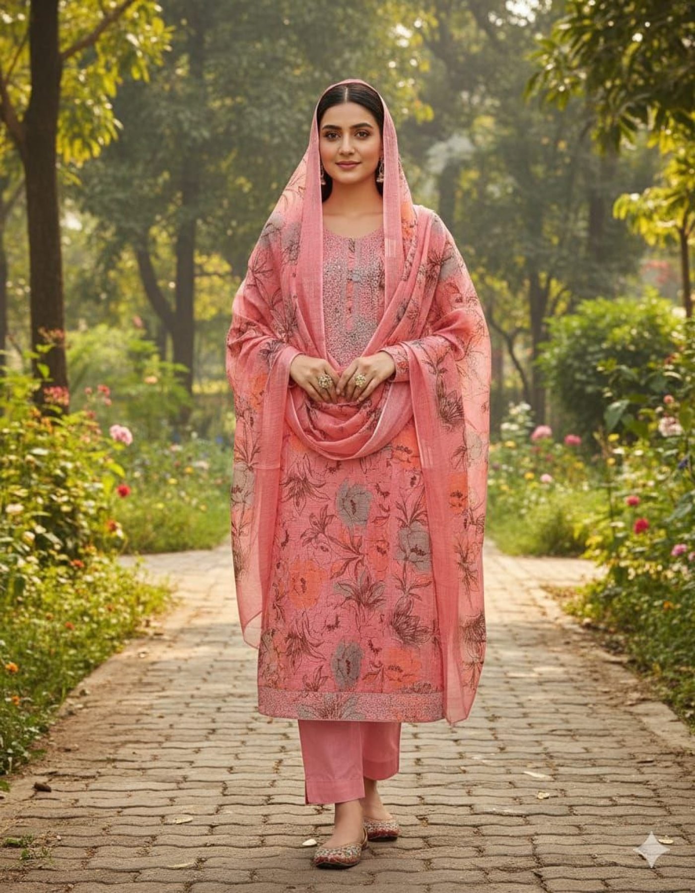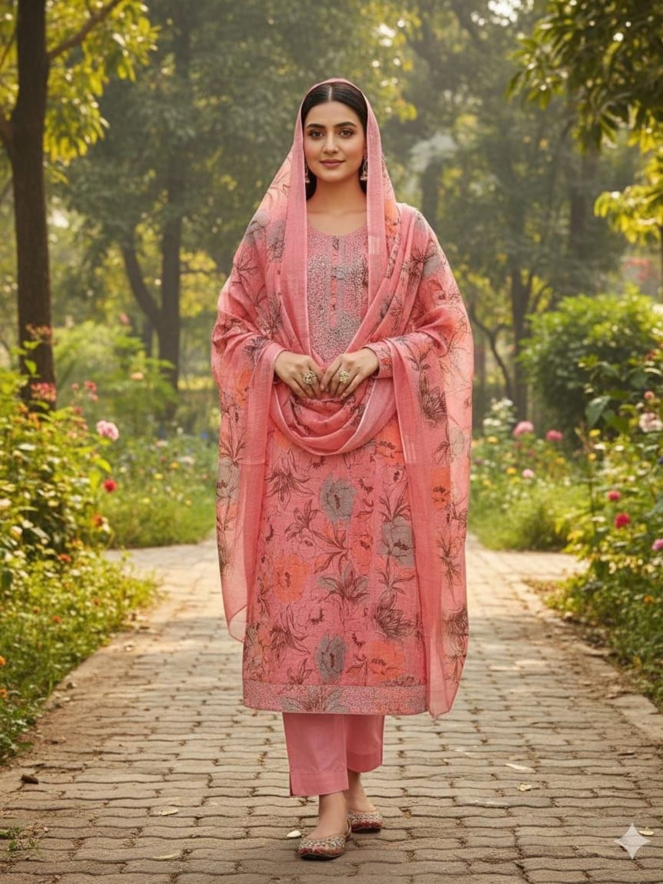 Comfortable mal cotton dress material set featuring stylish digital print with multi work detailing. Paired with santoon bottom and inner along with a matching dupatta, ideal for daily wear and casual styling.