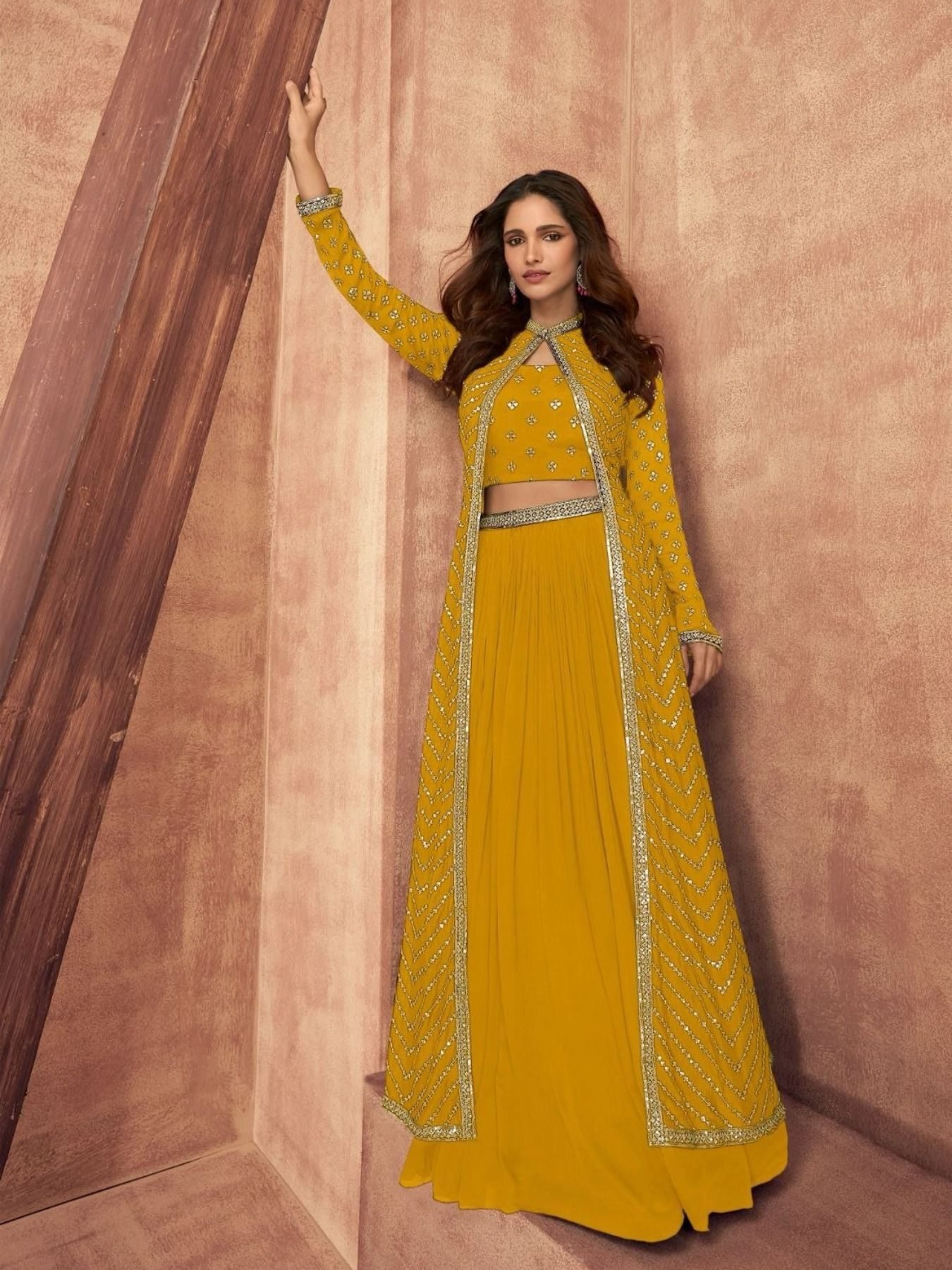 Elvora Yellow Georgette Embroidered Long Jacket From Sayuri Designer