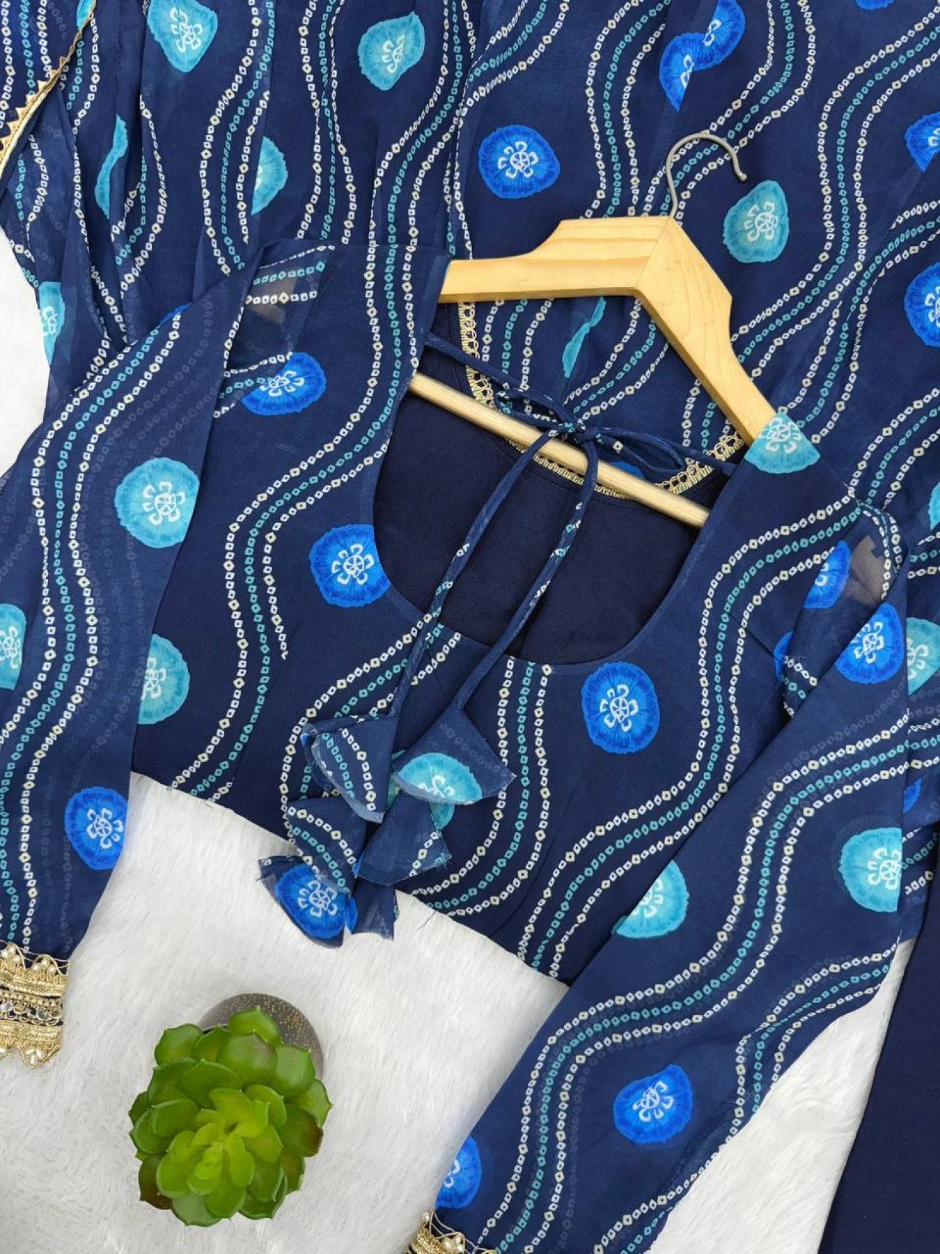 Embellished 4 Mtr Flair Bandhani Fox Georgette Gown with Pant Dupatta at Wholesale Rate for Festive Wear