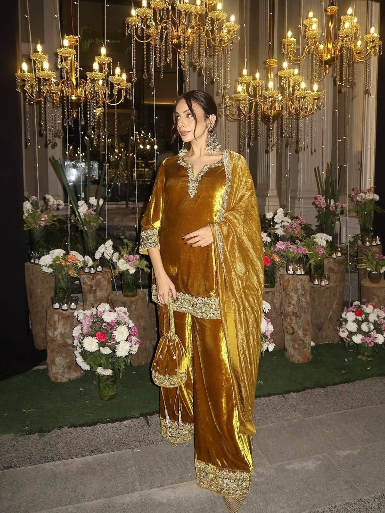 Embellished Velvet Sequins Zari Embroidery Kurti Plazzo Fendy Silk Dupatta for Weddings