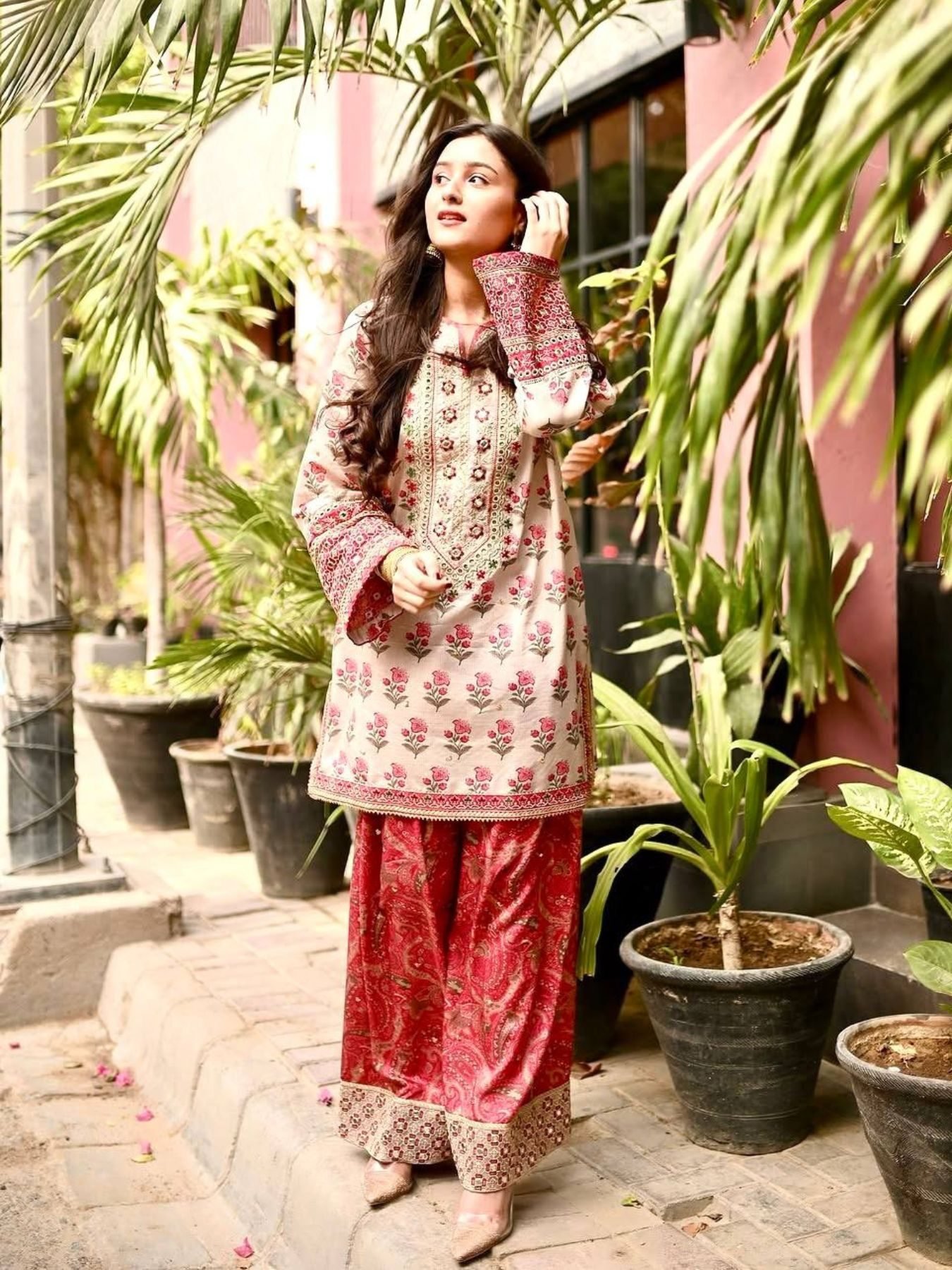 Comes with a stylish Farshi Palazzo and a soft faux georgette dupatta with lace border for an elegant festive look.