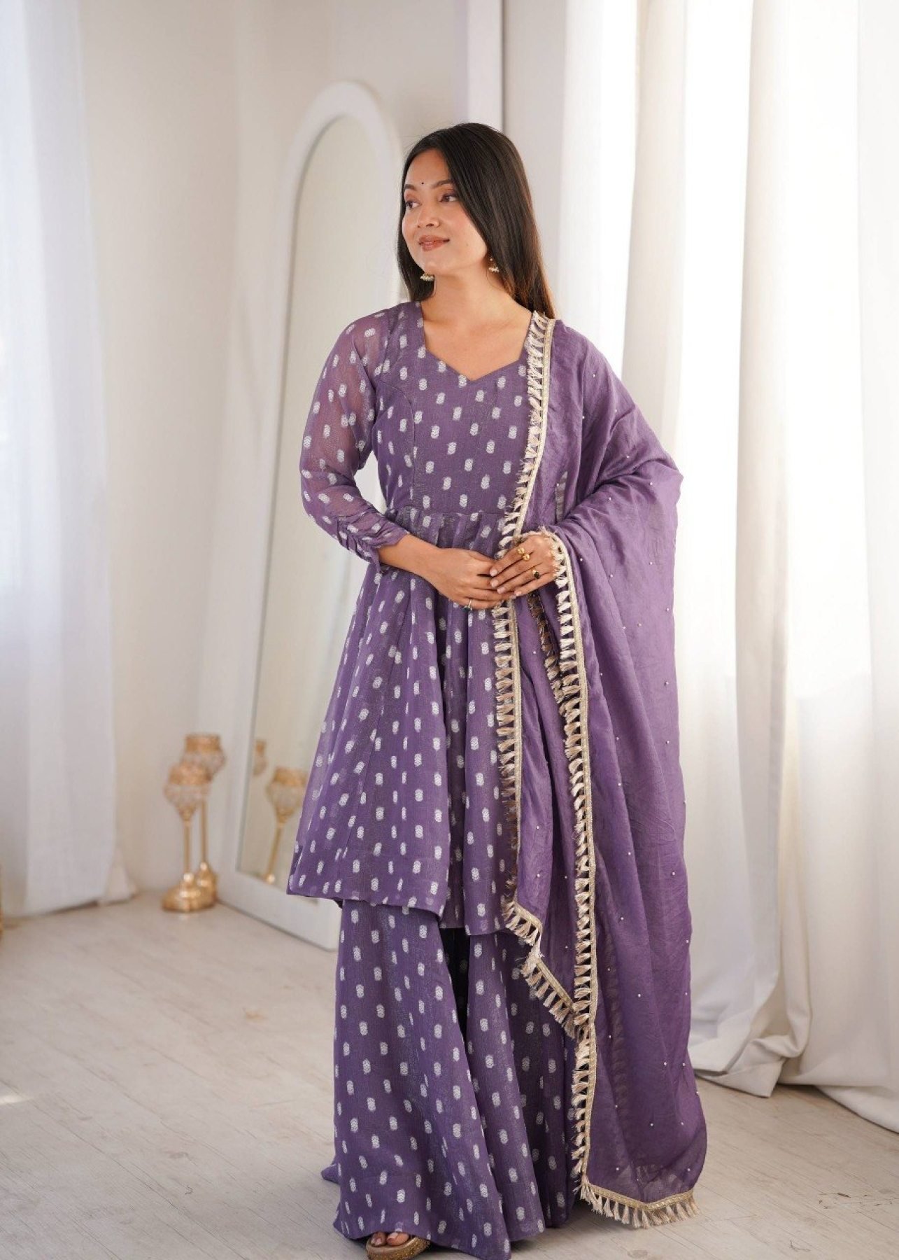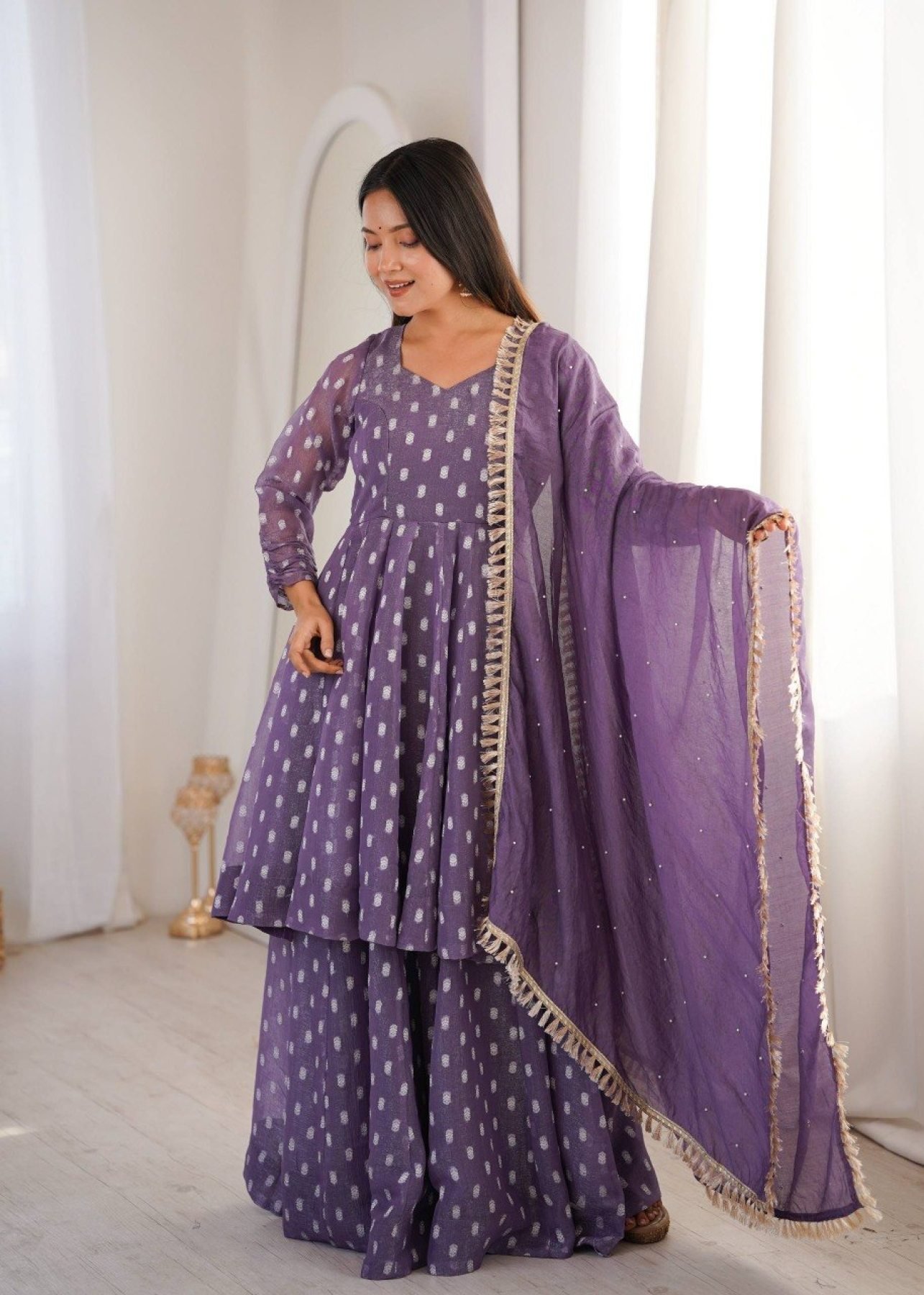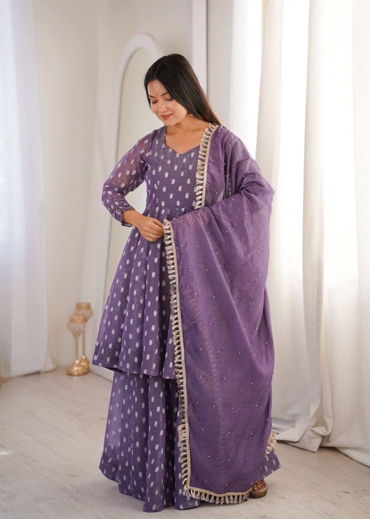 Premium crunchy silk sharara suit set featuring jacquard butti work with matching dupatta and lace border. Perfect for festive and party wear.