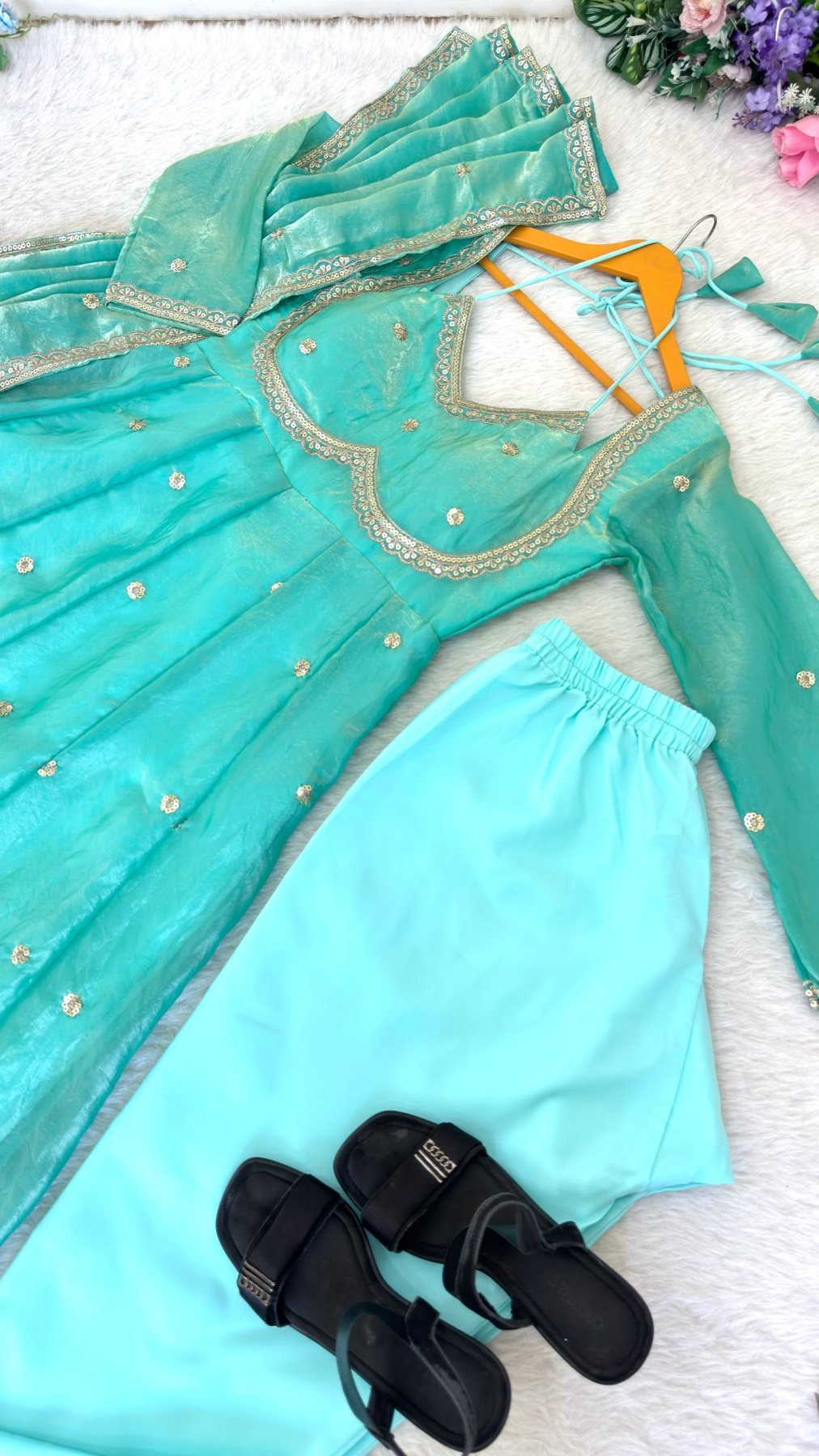 Enduring Sky Blue Anarkali Gown with Dupatta and Pant for Festive Wear