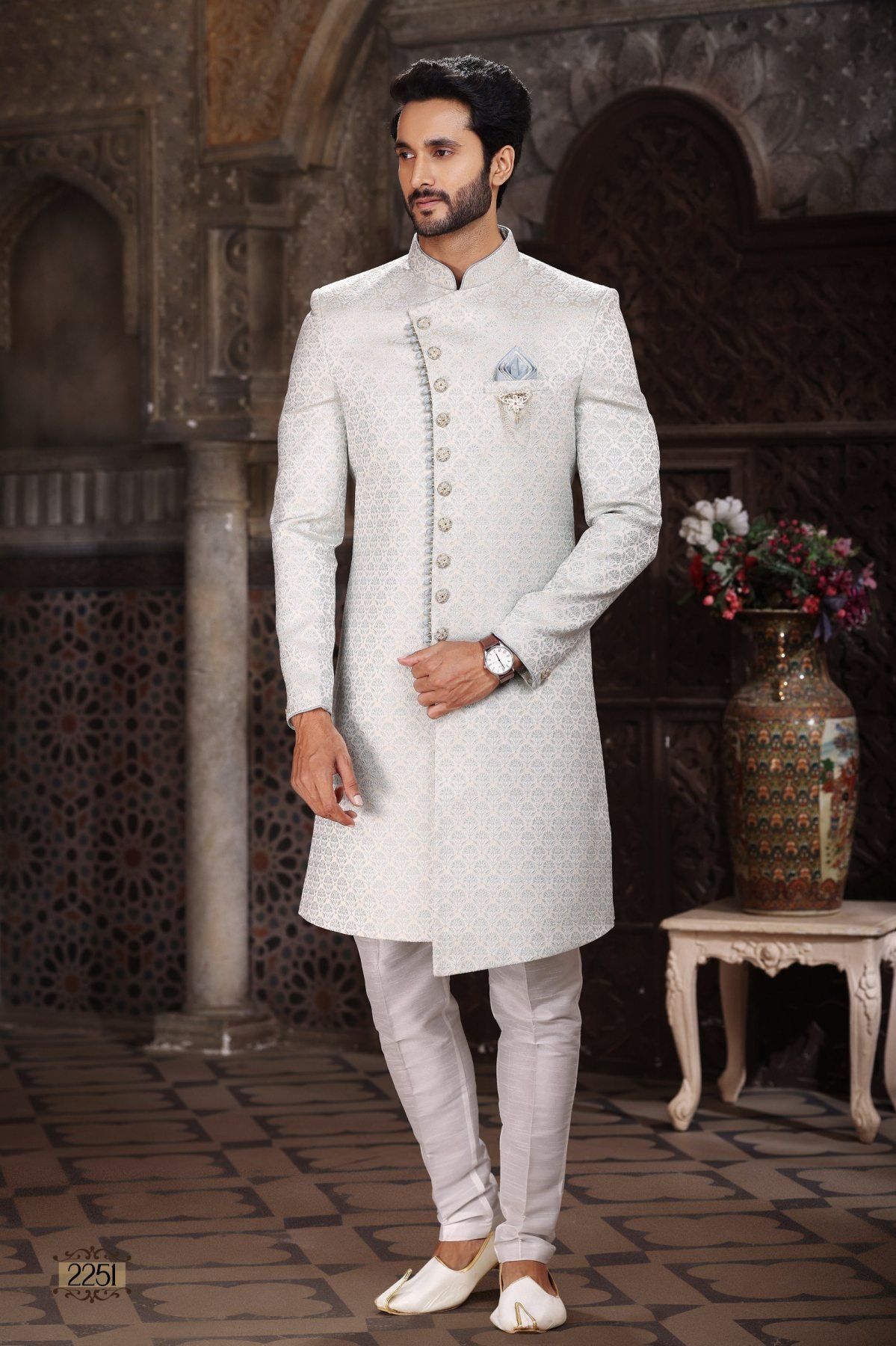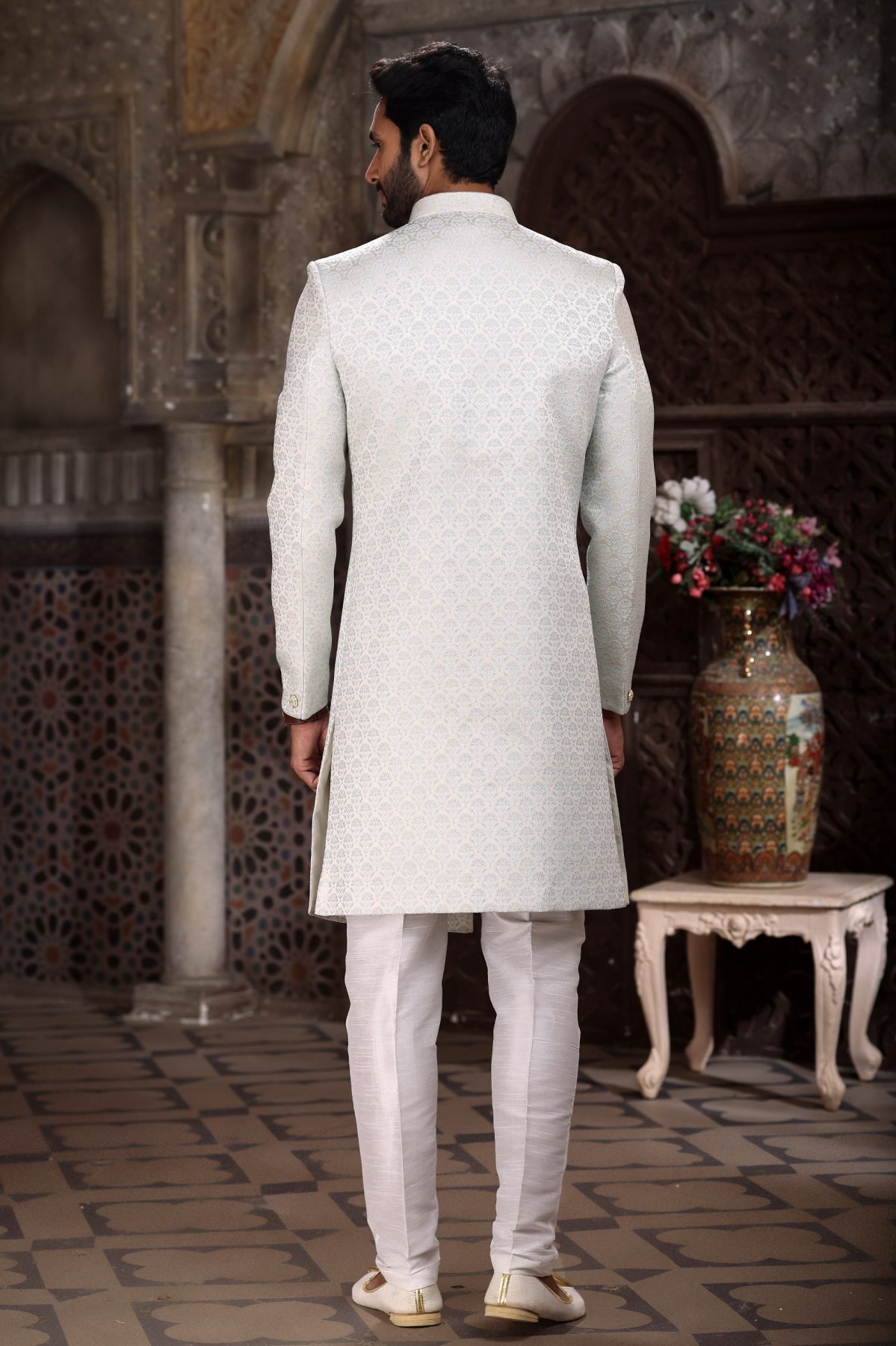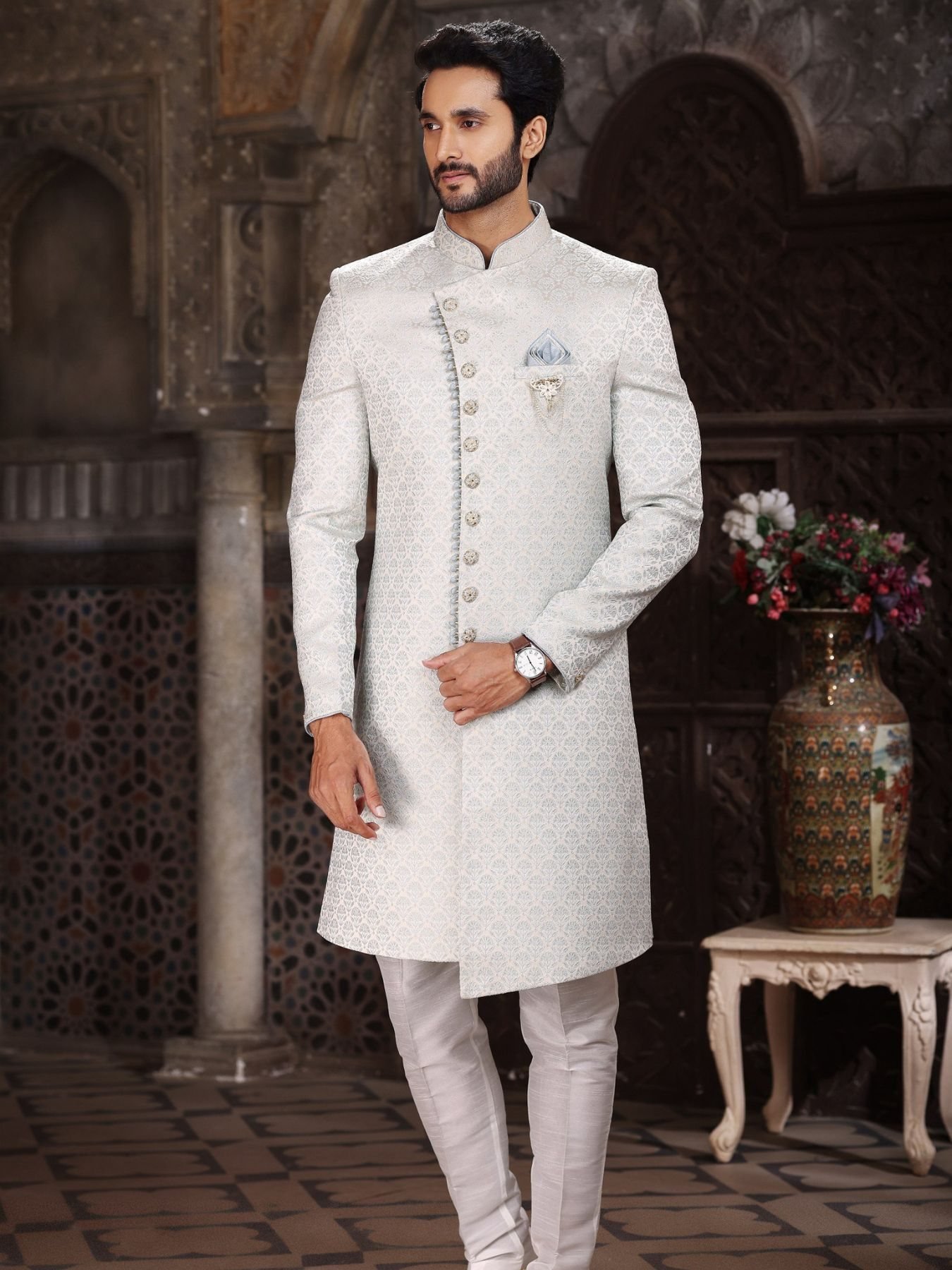 Premium Indo western set crafted in Banarasi jacquard with designer pattern work, paired with dupion art silk Aligarhi pants. Perfect for weddings and festive occasions.