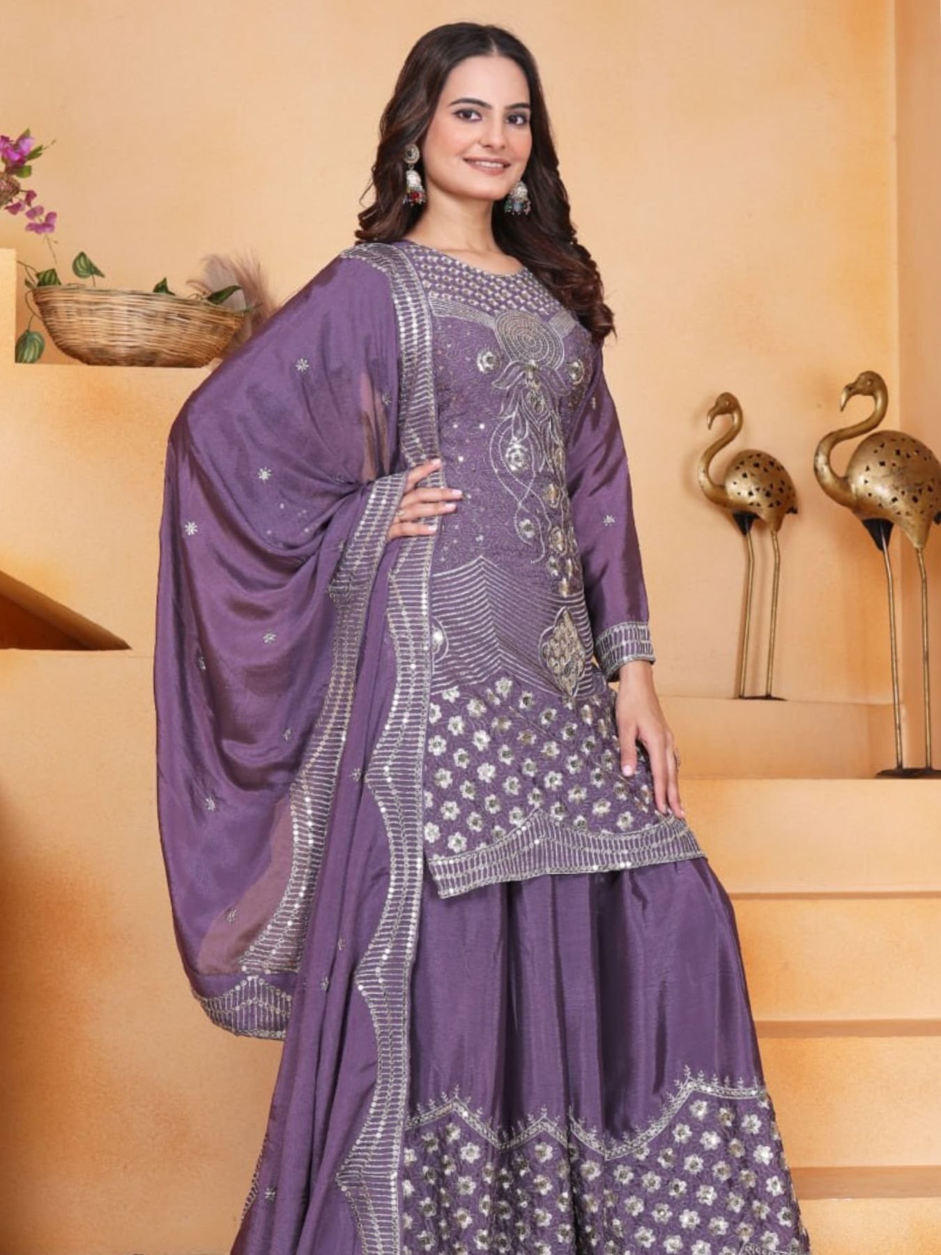 Ethnic Purple Chinon Sharara Set with Embroidery Work Wedding Outfit for Women